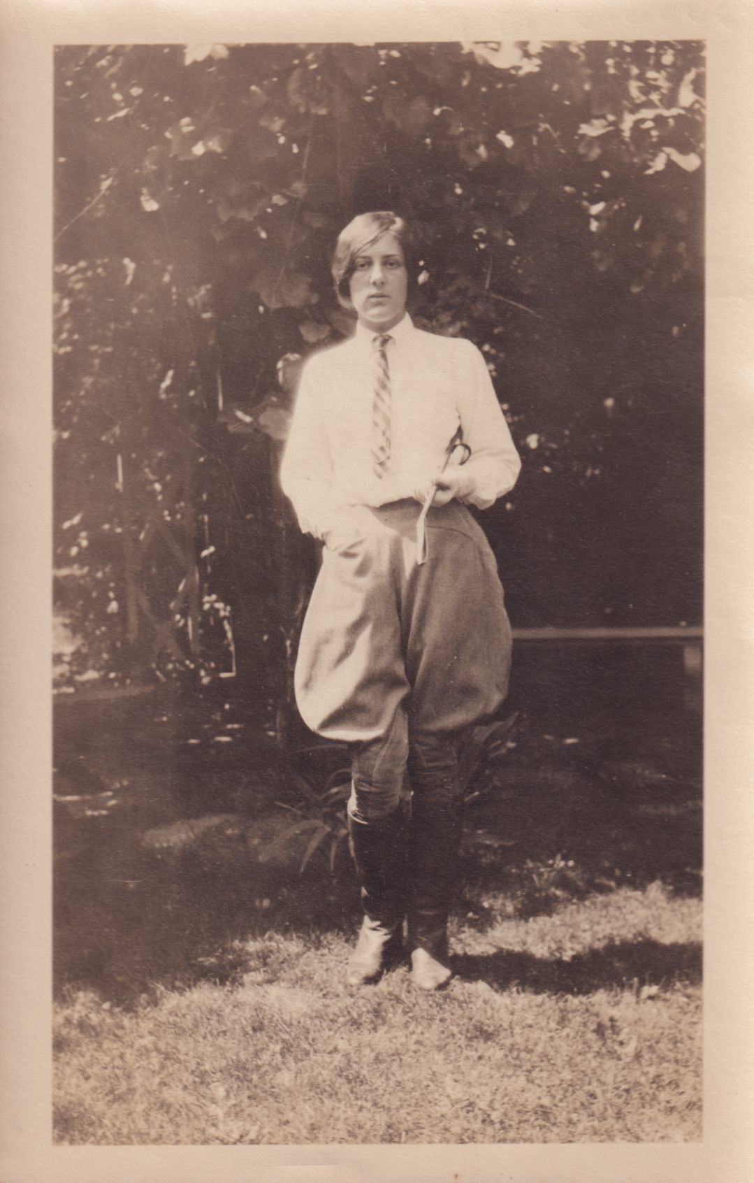 Photograph of a young woman in riding gear holding a crop. May be Hazel Durbin.