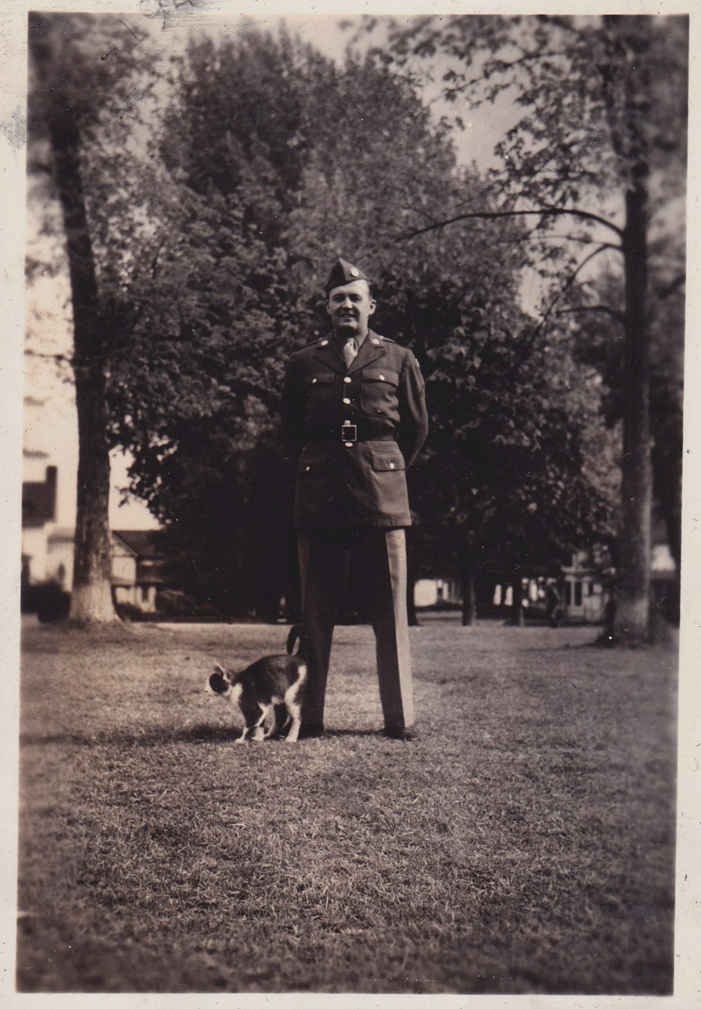 Black-and-White photograph of an unidentified man in military uniform. A cat is rubbing against his ankles.