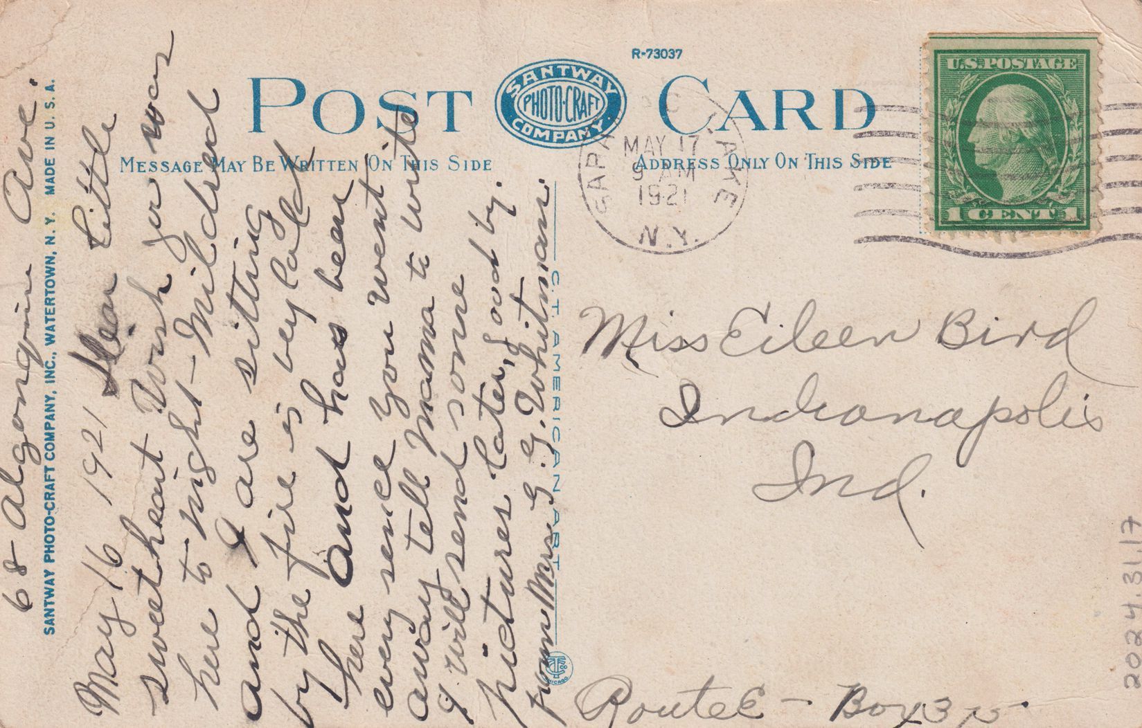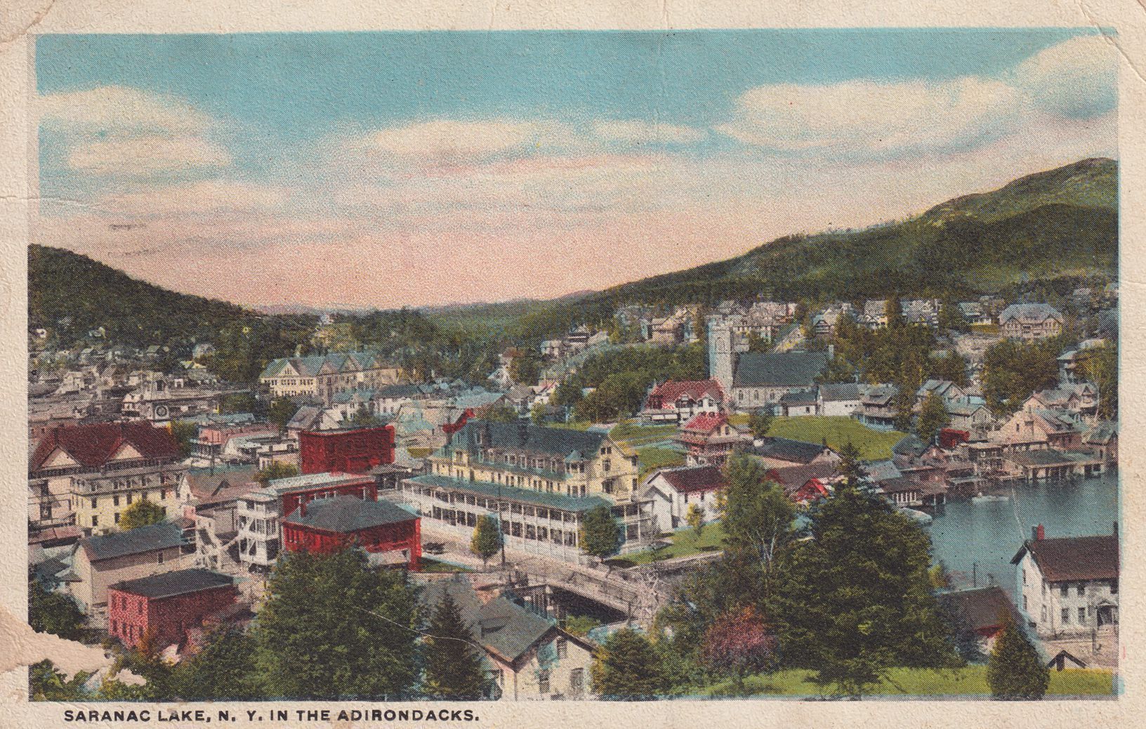 Color postcard showing a view of Saranac Lake and Lake Flower from Blood Hill/Lake Street Hill. Printed caption on front reads, "Saranac Lake, N.Y. in the Adirondacks." Printed by the Santway Photo-Craft Company, Inc., Watertown, N.Y. Used, divided back, white border, postmarked Saranac Lake, May 17, 1921. Handwritten message on reverse reads, "68 Algonquin Ave., May 16, 1921. Dear little sweetheart, Wish you was here to night. Mildred and I are sitting by the fire it is very cold here and has been ever since you went away. Tell mama to write, I will send some pictures later, good by. From Mrs. G. G. Whitman." Mailed to Miss Eileen Bird, Indianapolis, Ind.Subject Place