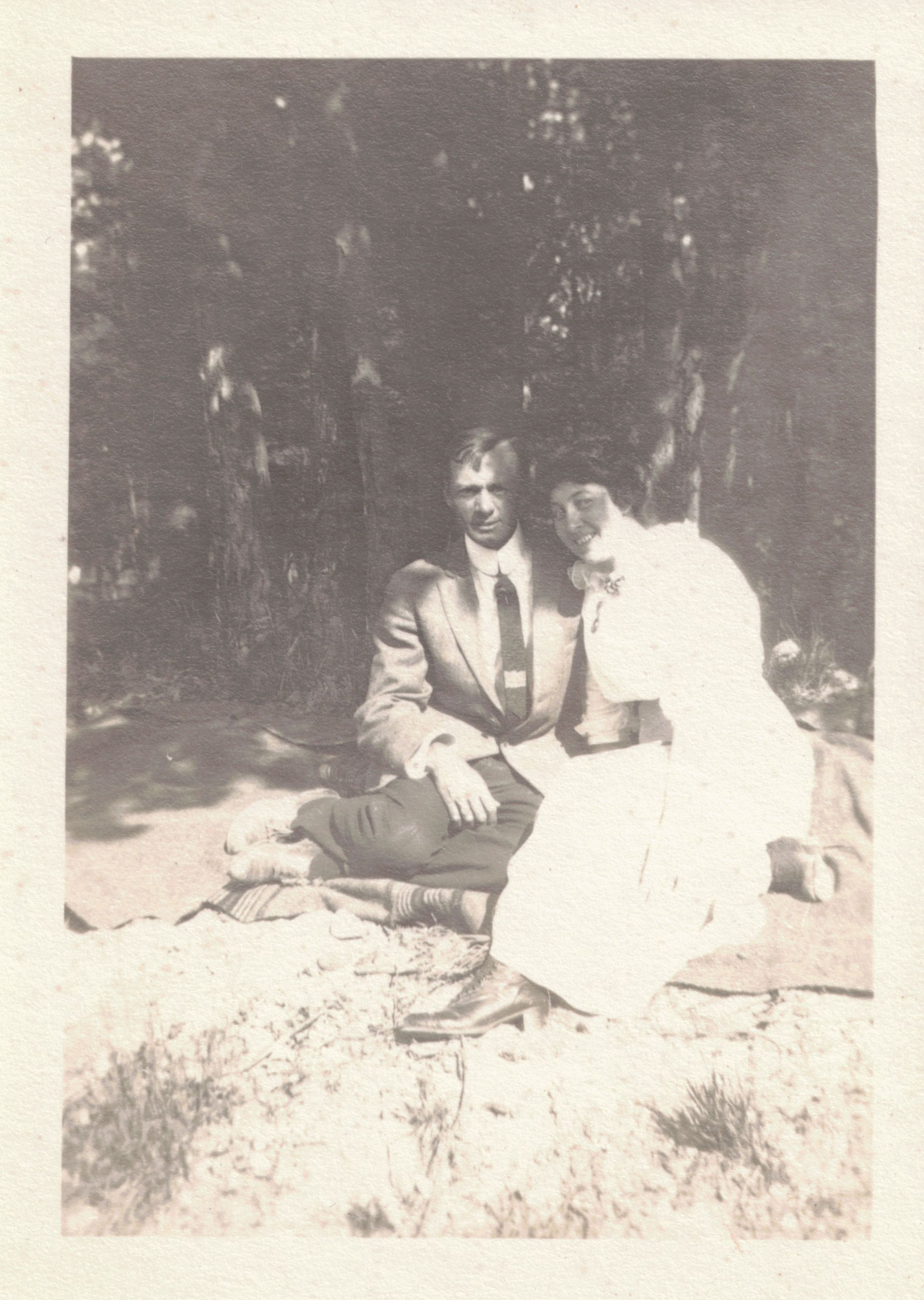 Photograph of William and Tarsilla Schuster sitting beneath a tree in the woods.