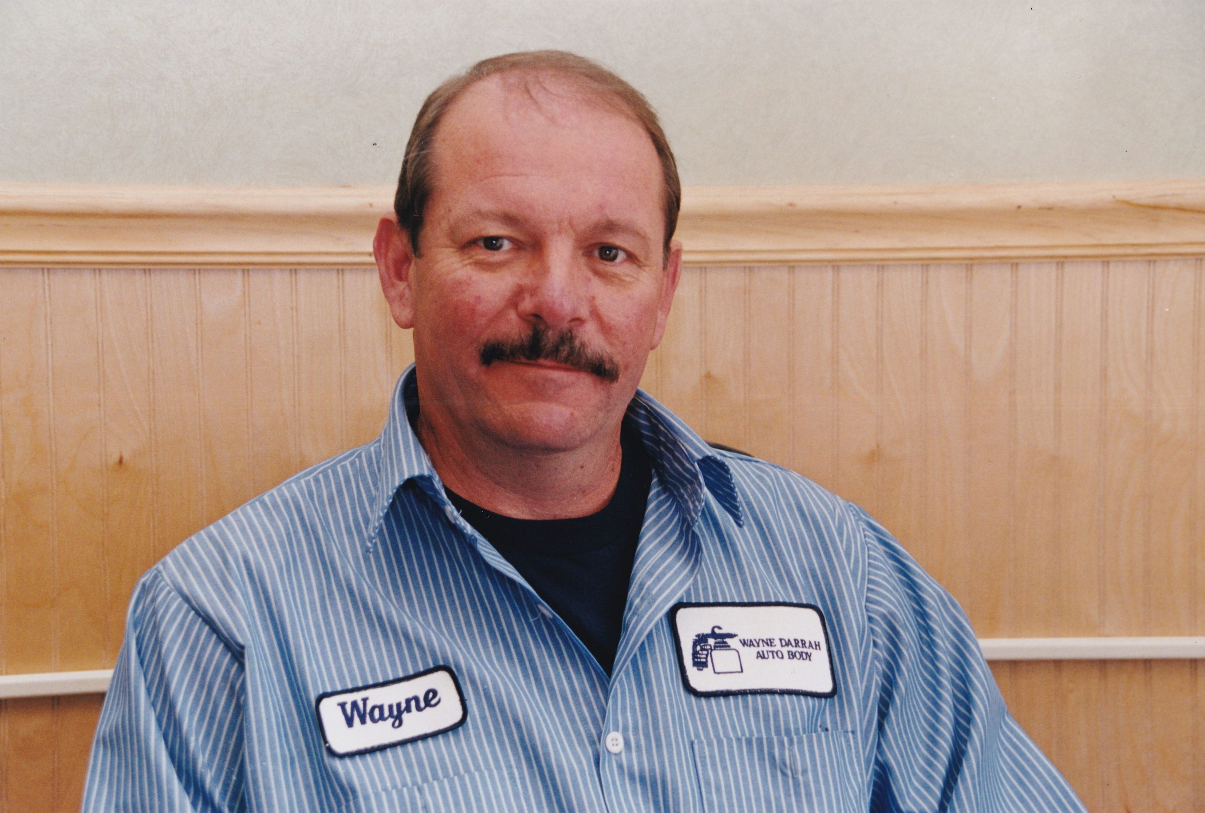 Color photograph of Wayne Darrah inside of his business, Wayne Darrah Auto Body. Portrait taken by Mary Lou Hanpeter Banks as part of her Soul Proprietor exhibition.
