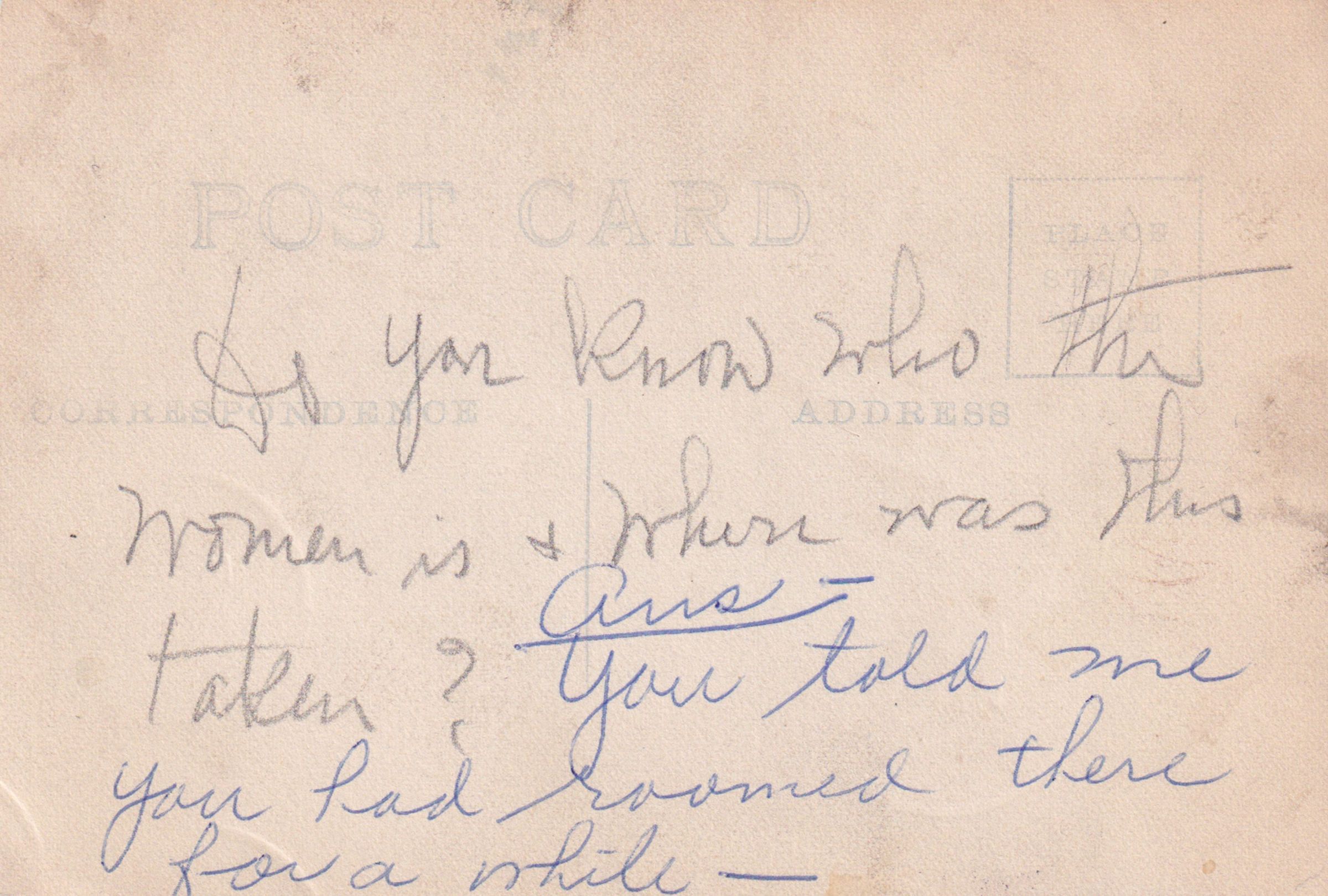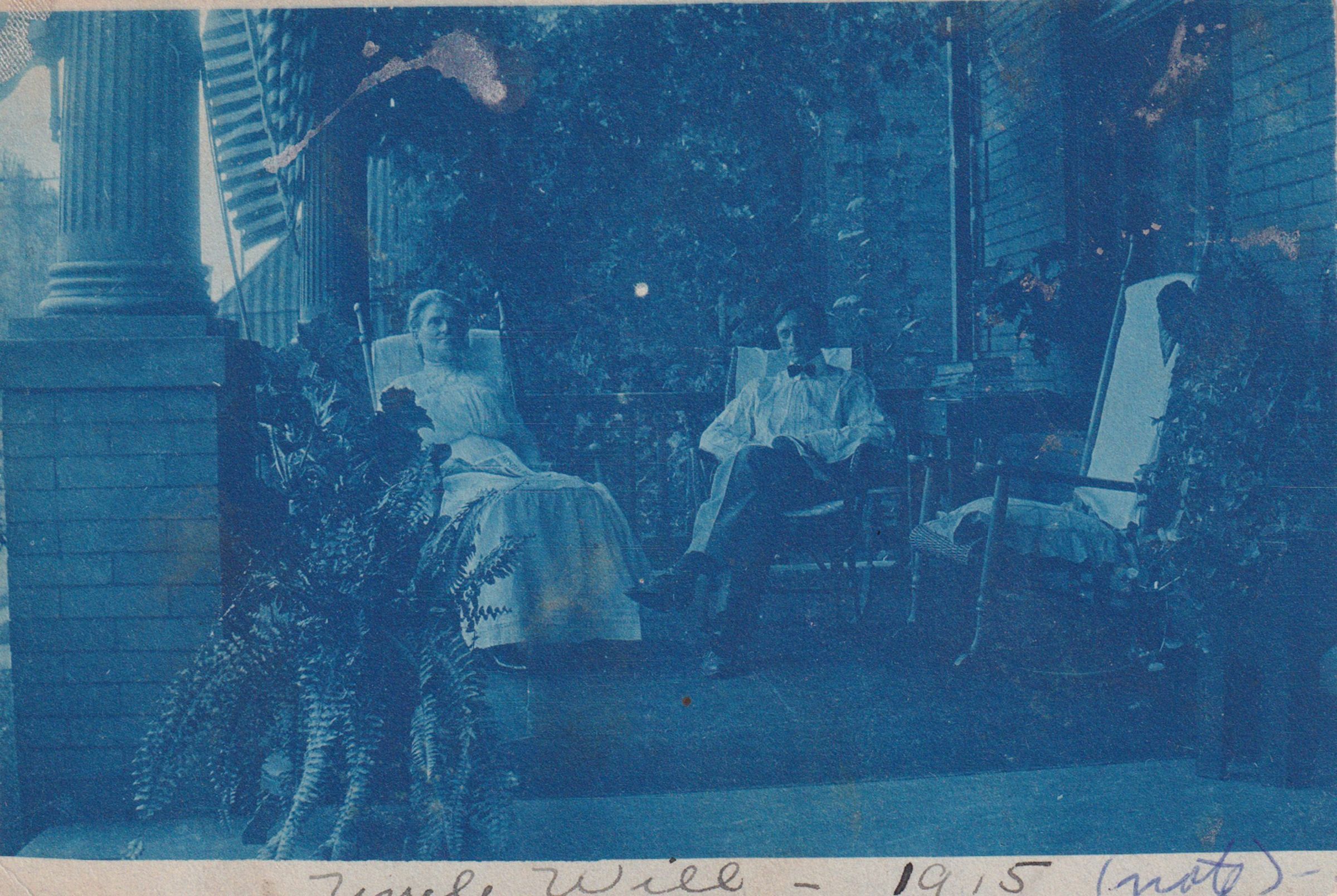 Cyanotype photograph of William Schuster and an unidentified woman sitting in chairs on a porch. Caption below reads, "Uncle Will - 1915." Caption on postcard backing reads, "Do you know who the woman is and when was this taken? Ans - You told me you had roomed there for a while."