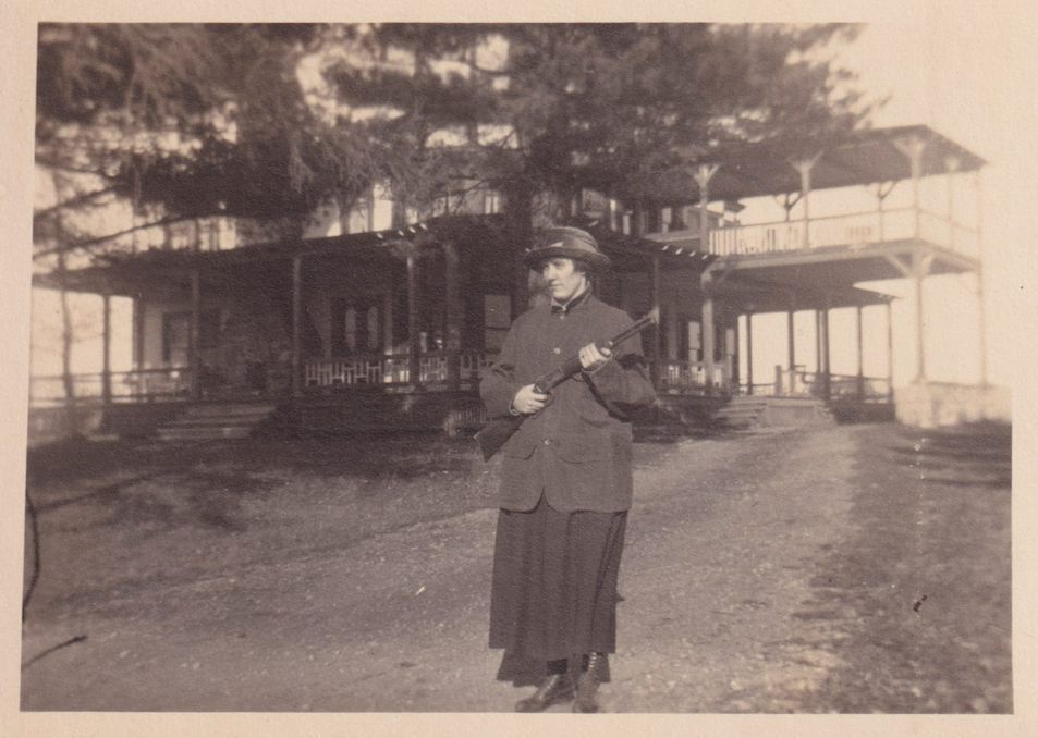 Black-and-White photograph of an unidentified woman holding a rifle. She is standing in the driveway of a building with large porches/verandas. The photograph was likely printed by Kollecker's Kodak and Gift Shop.