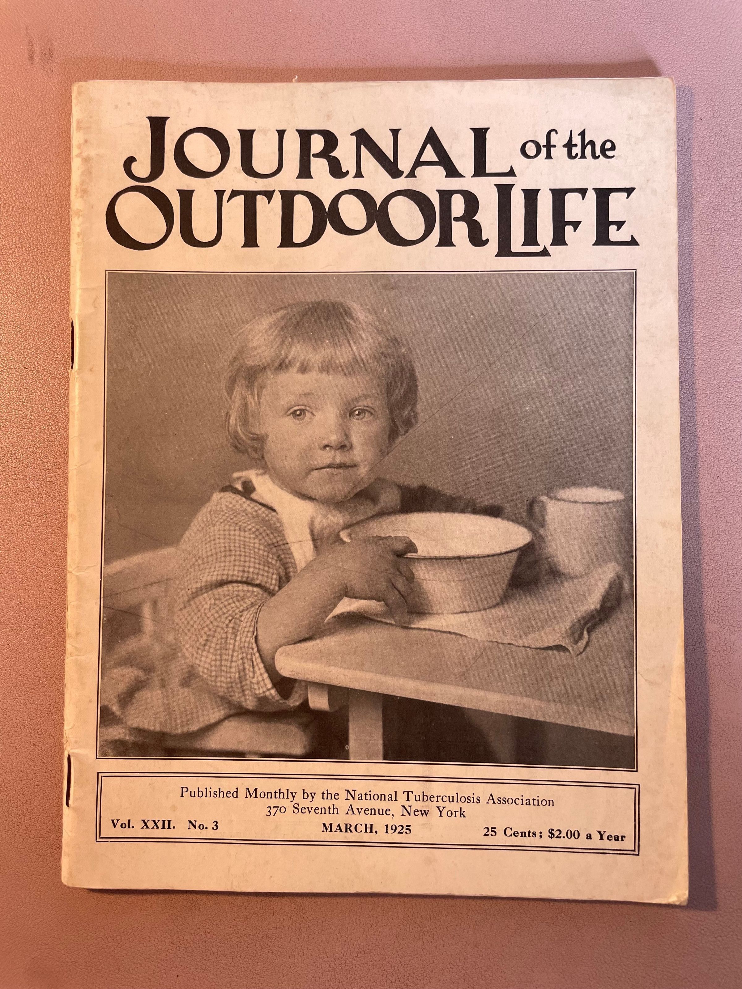 Journal of the Outdoor Life, March 1925. Includes articles on a variety of topics related to tuberculosis and its treatment. Many ads for sanatoria, cure cottages, and products for TB patients. Cover shows a photograph of a small child seated at a table with a bowl and cup.