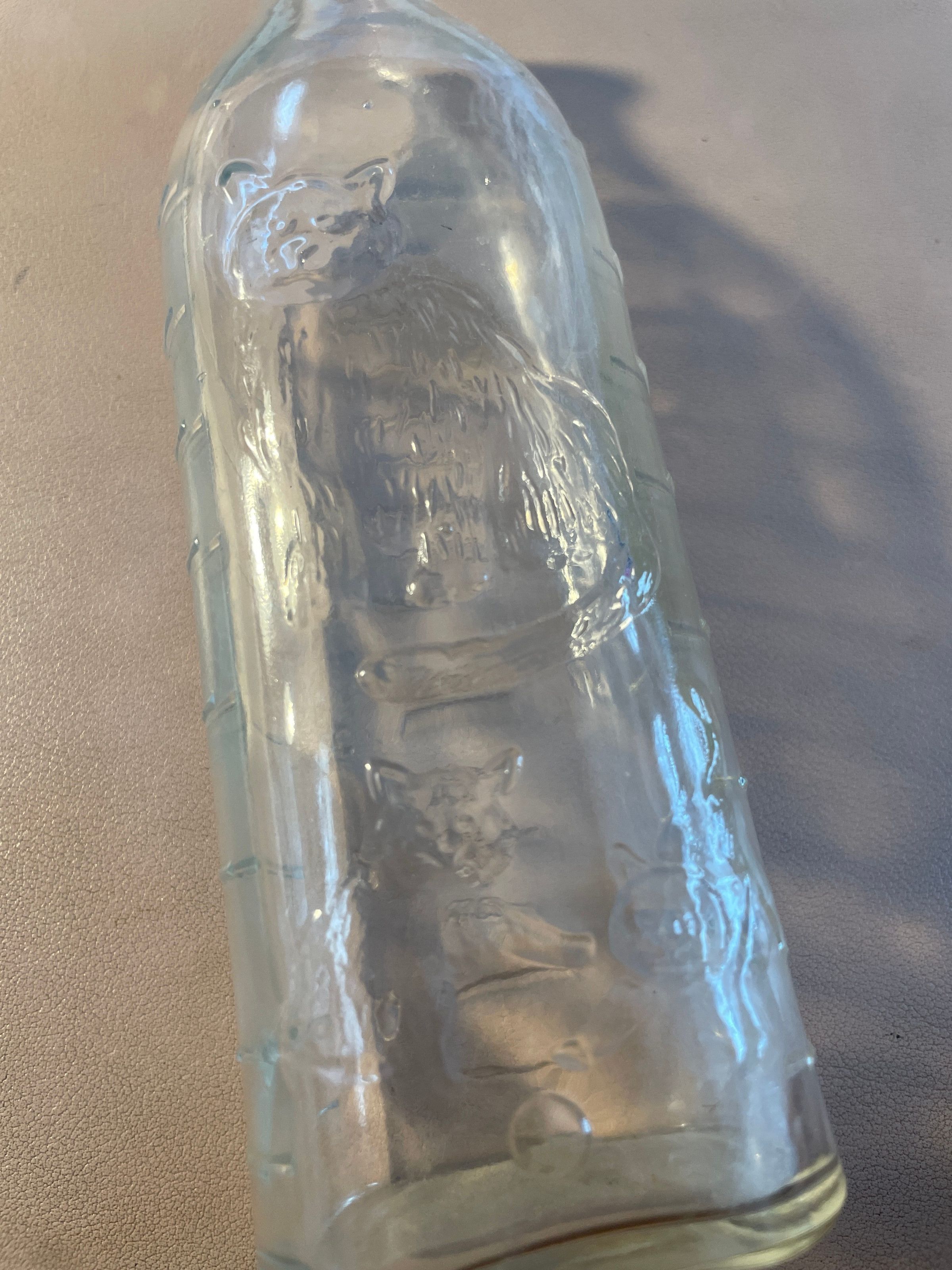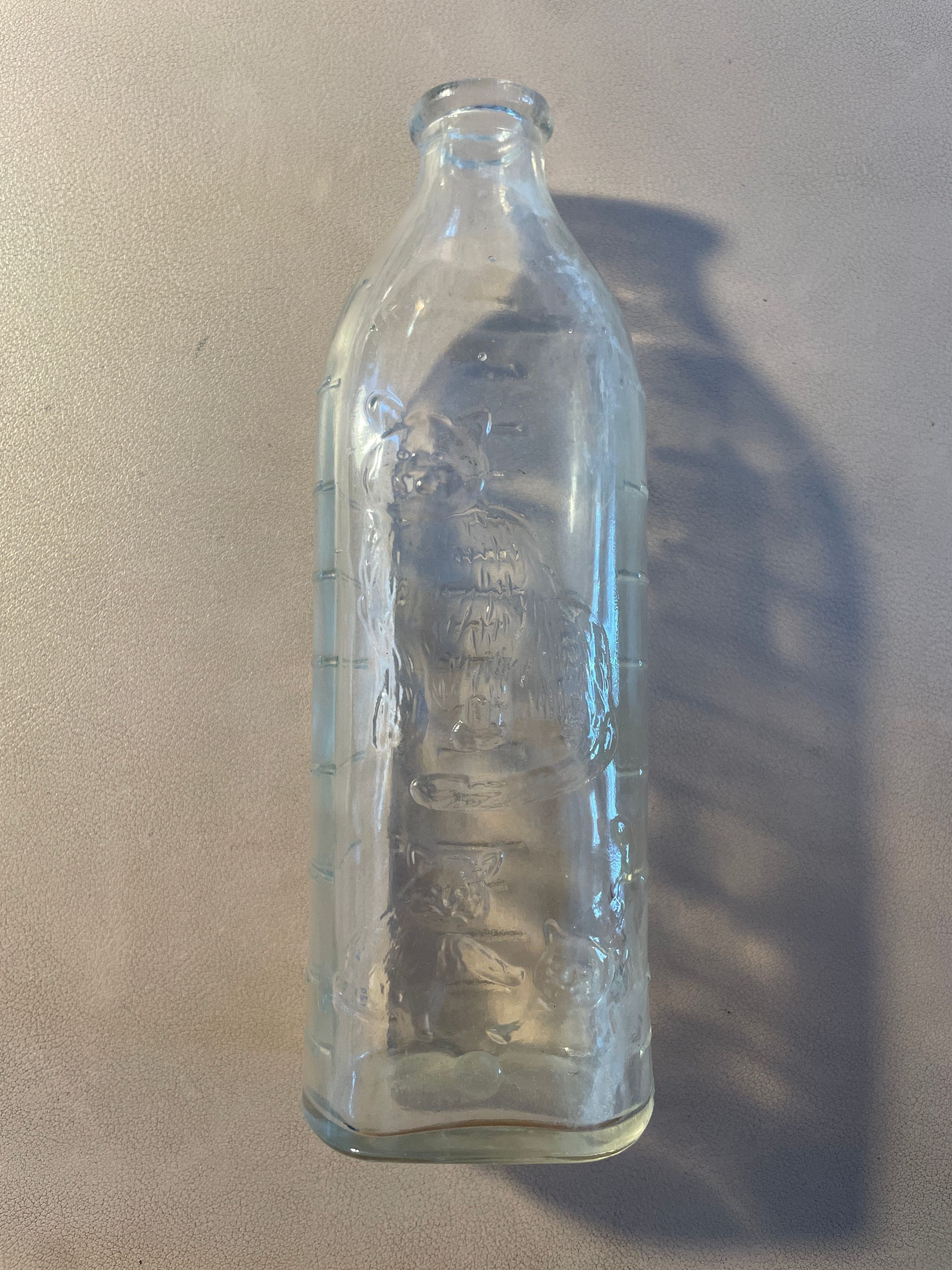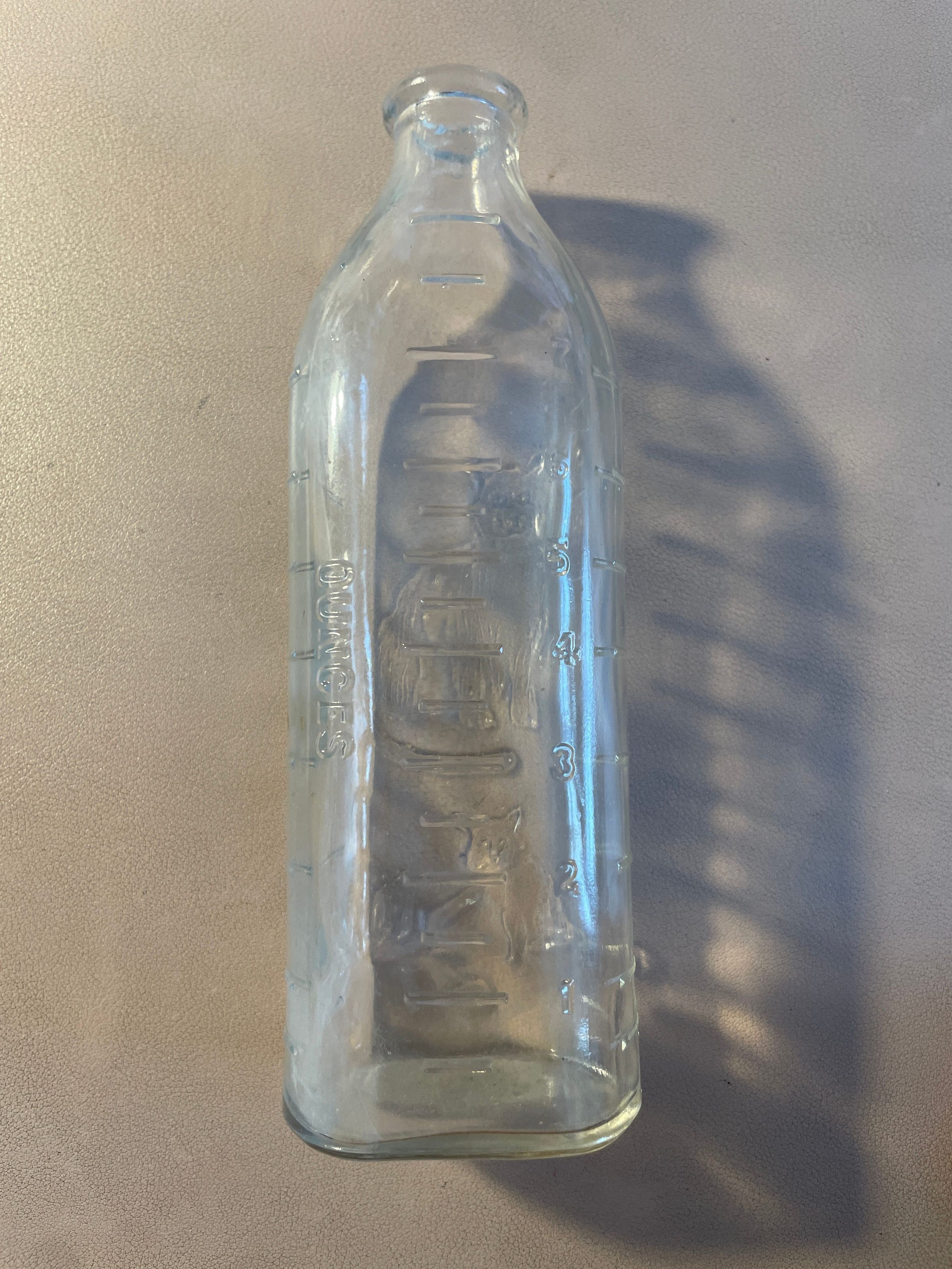 Glass bottle with illustration of cat and two kittens in raised glass. Has raised line markings for ounces on back and both sides. Found during renovations at 73 Dorsey Street.