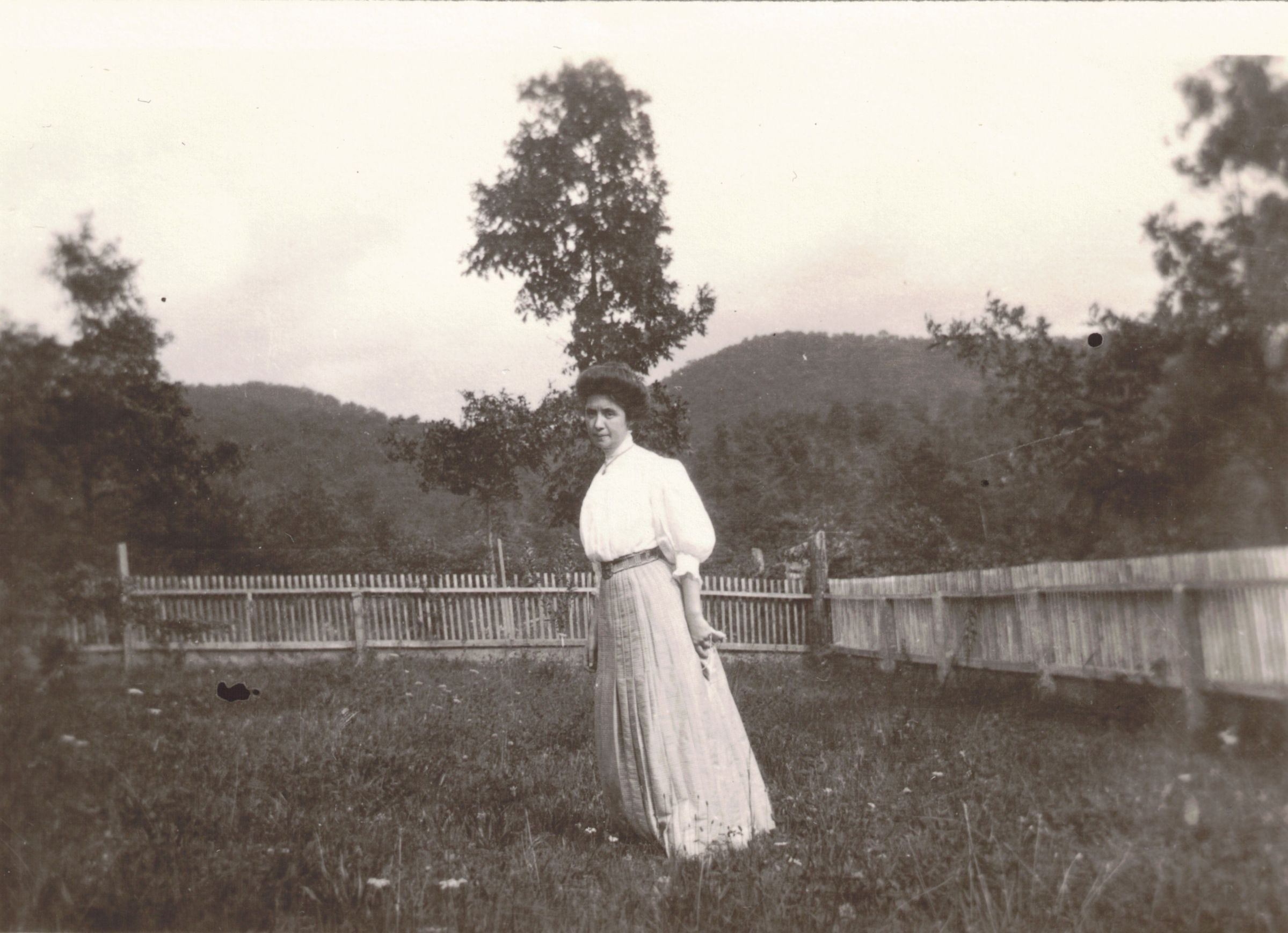 Photograph of Tarsilla Schuster standing outside surrounded by a fence with trees in the background. Caption on reverse reads "TVFS.”