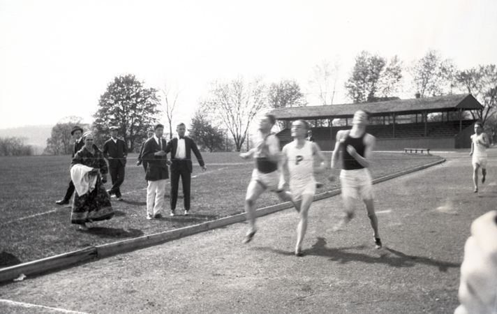 Negative of an outdoor track or cross country race. There are four blurry runners racing on a dirt track. Three of them are very close together and the fourth is a few paces behind the rest. There are spectators watching from either side of the track. Most likely taken by Henry Ives Baldwin. This item is not fully cataloged but has been uploaded so the image is publicly available; if you would like us to prioritize cataloging this item, please contact the HSL Collections team.