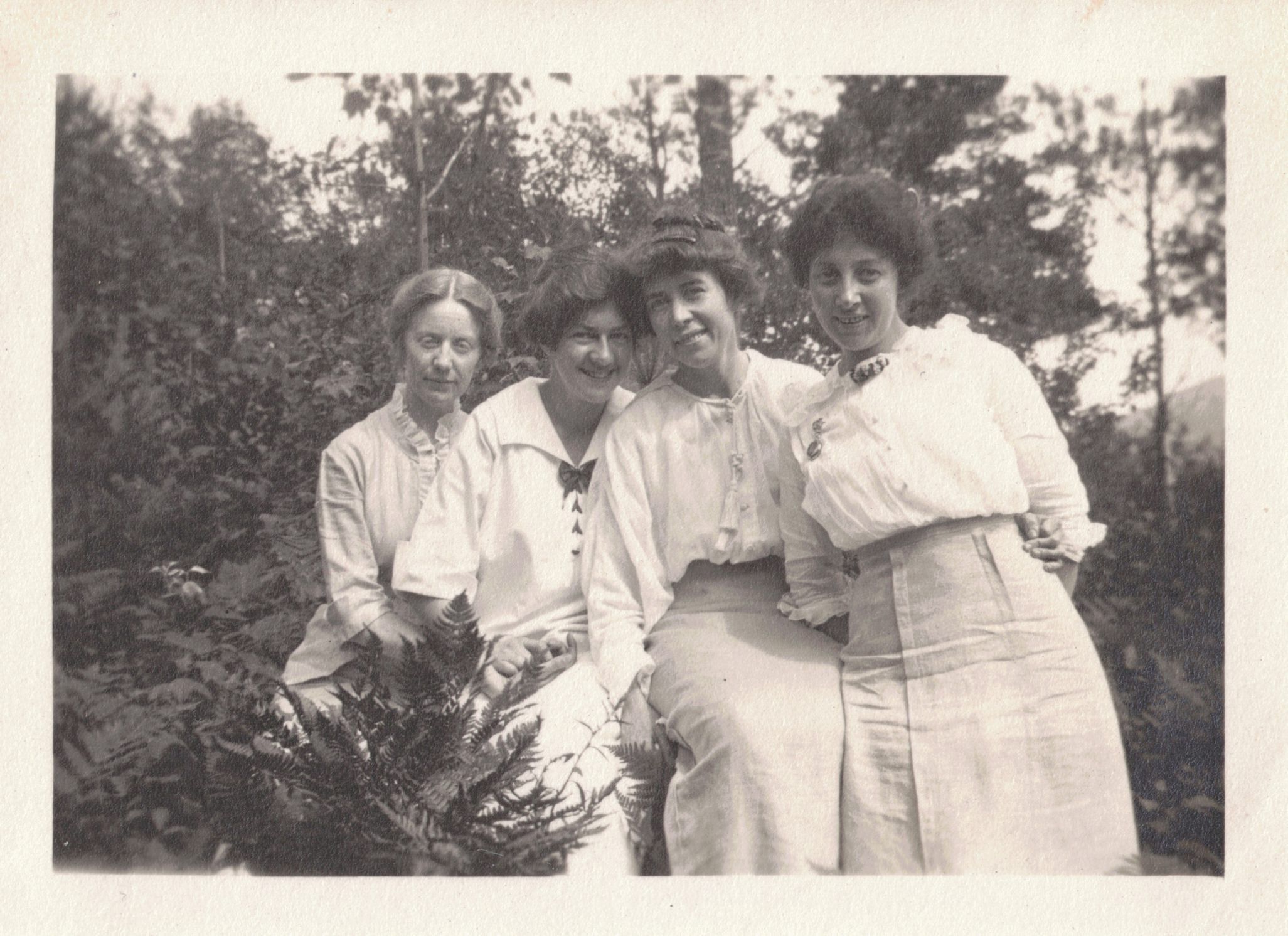 Photograph of Tarsilla Schuster with three other unidentified women, surrounded by trees. Caption on reverse reads "TVFS in front."