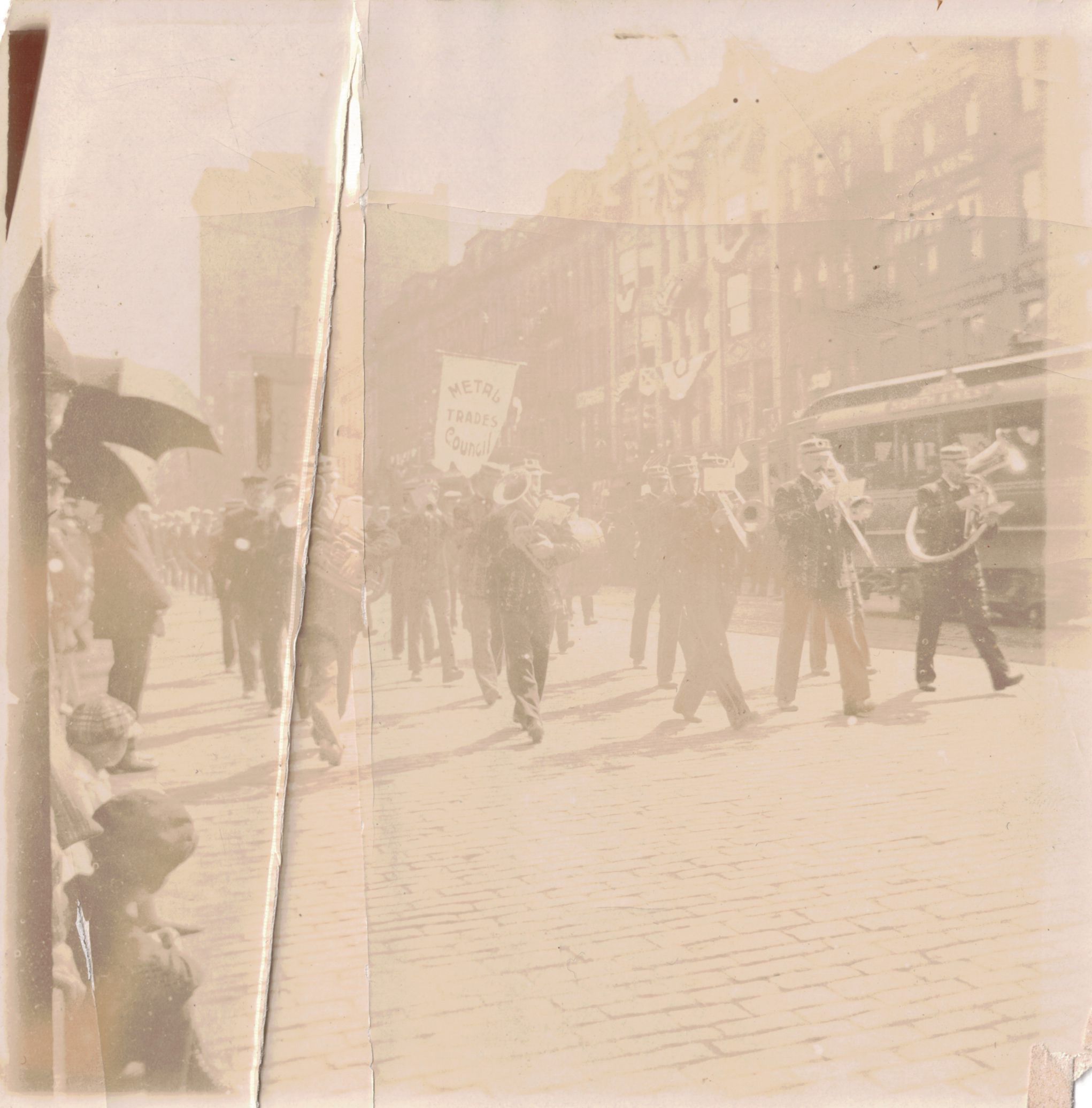 Photograph of a band marching in the street with a banner for the "Metal Trades Council." There is a streetcar in the background, and it does not appear to have been taken in Saranac Lake or the surrounding area.