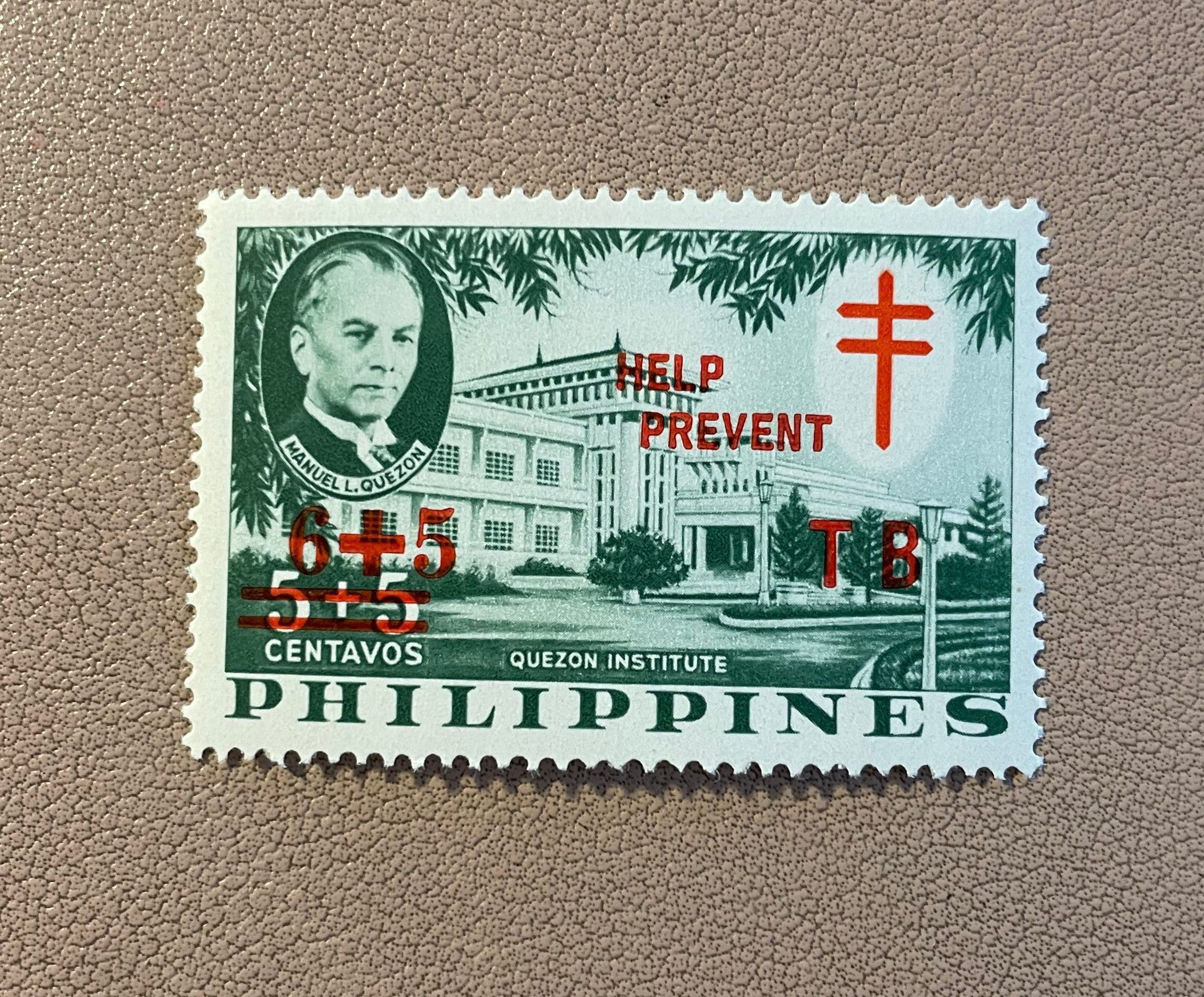 Filipino postage stamp with image of the Quezon Institute and inset image of President Manuel L. Quezon. Stamps are printed in green tone with red ink reading "Help prevent TB," and double-barred cross.