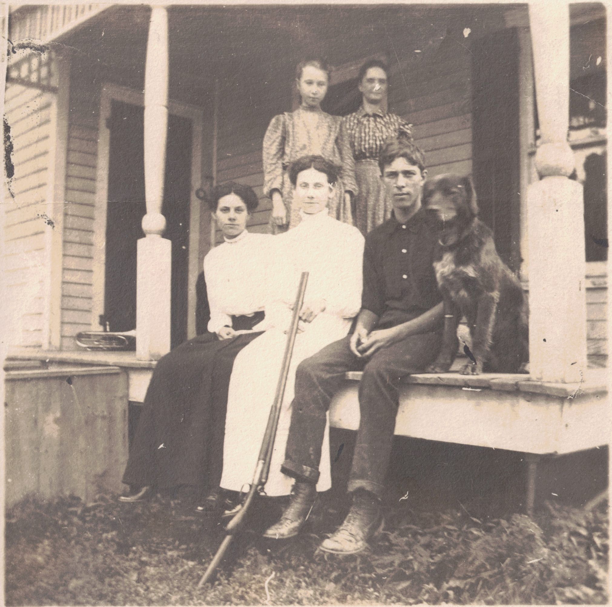 Photograph of four unidentified women and one unidentified man on a porch with a dog. The woman at center holds a rifle.