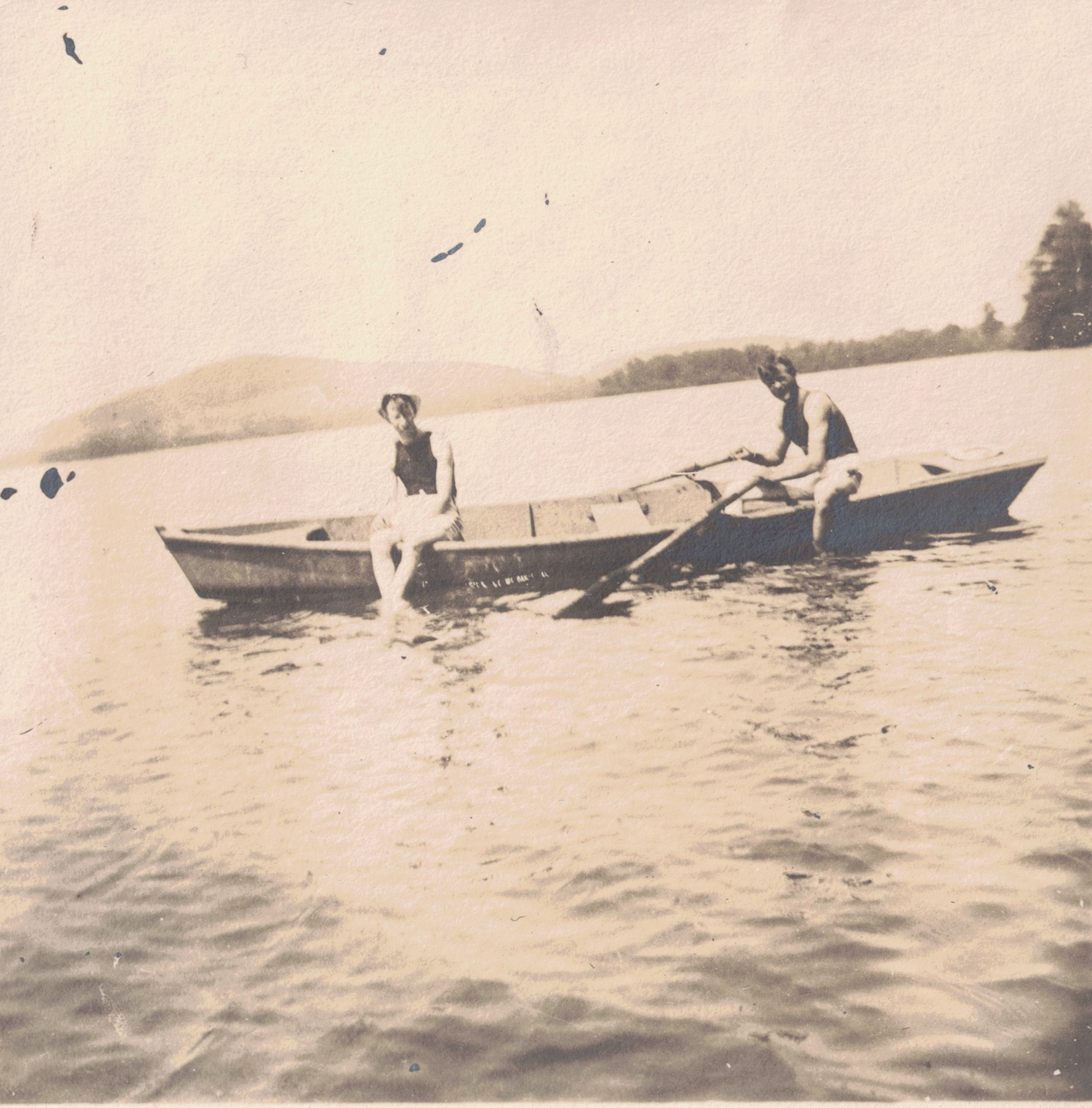 Photograph of two unidentified men sitting in a rowboat on a lake. The man in the back, possibly William Schuster, rows while the man in front sits on the edge of the boat.