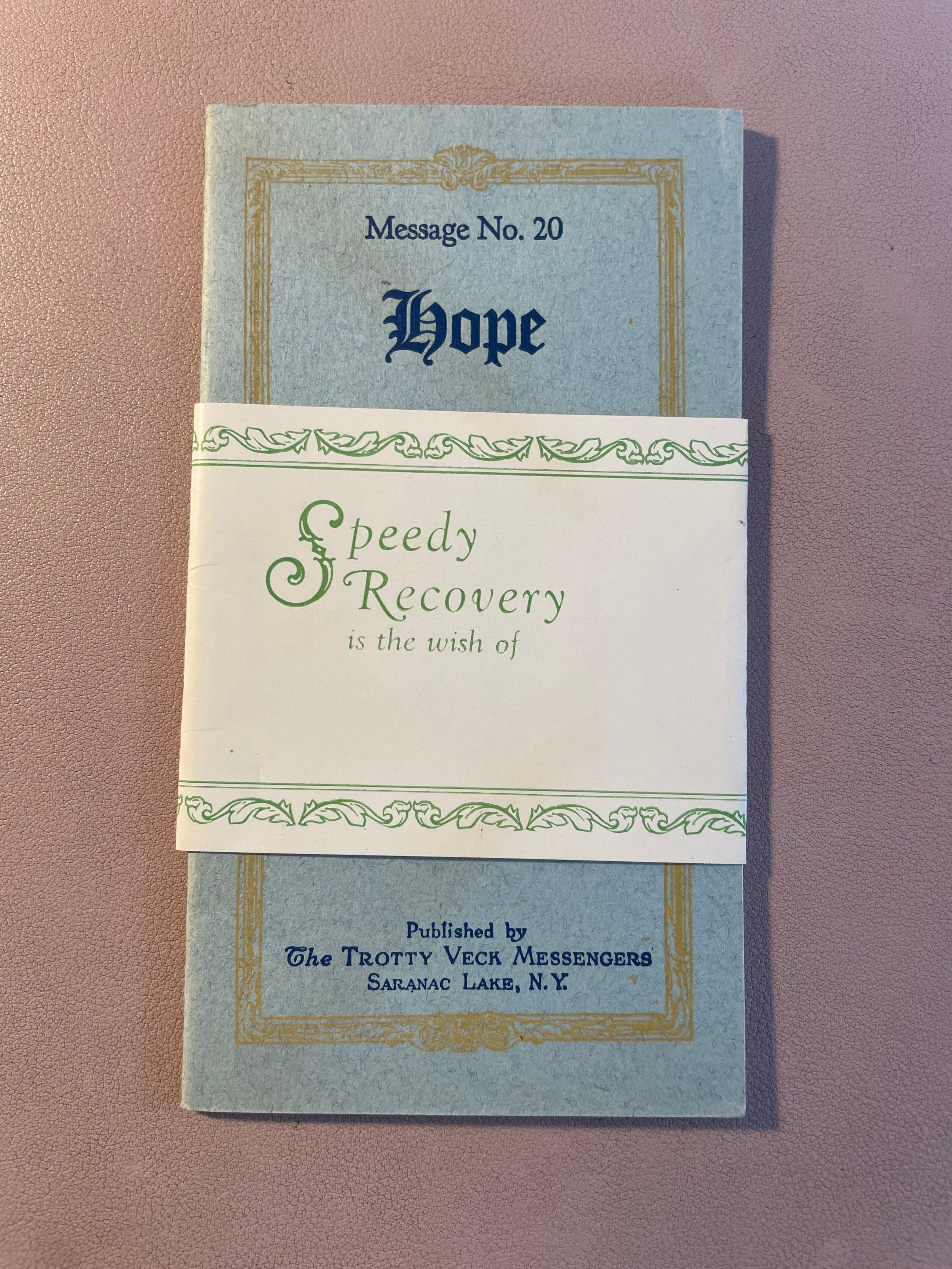 Trotty Veck Message No. 20: Hope. October 1931. Physical Description: Softcover. 3.25" w x 6"h. Light blue cover with yellow and navy ink. Has white sleeve folded around covers reading, "Speedy recovery is the wish of..."
