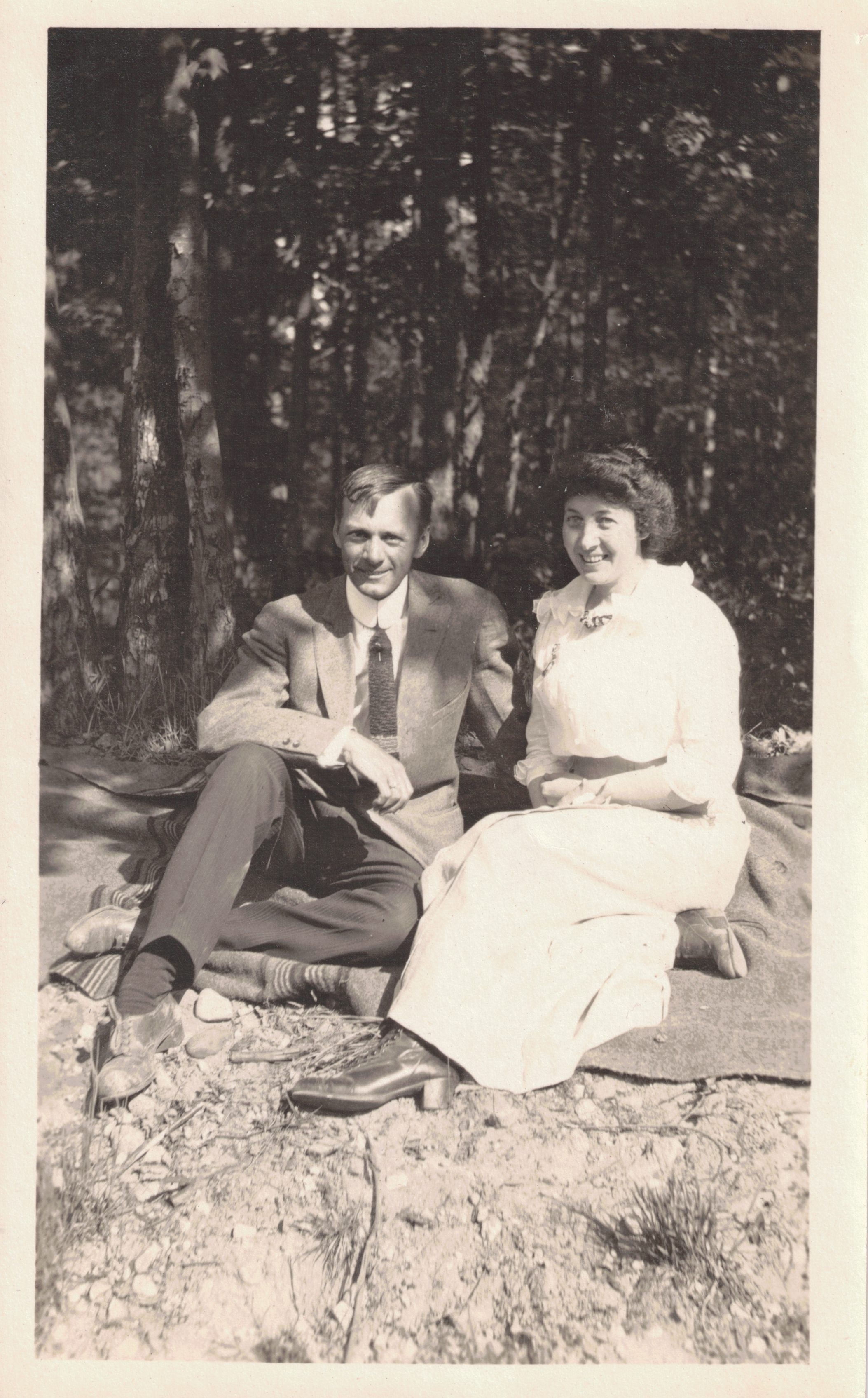 Photograph of William and Tarsilla Schuster sitting beneath a tree on a striped blanket. Caption on reverse reads "Taken May 30, 1914."