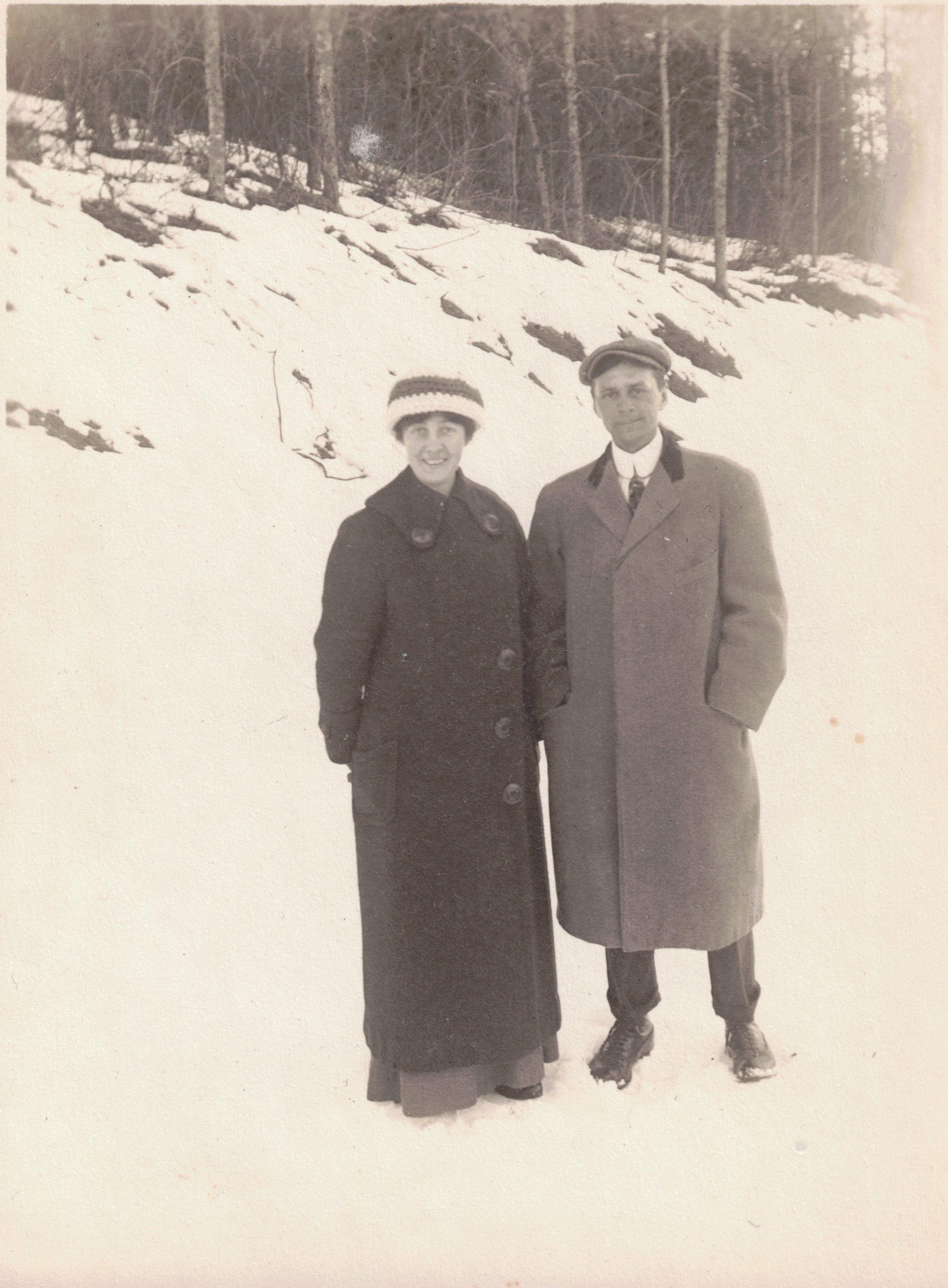 Photograph of William and Tarsilla Schuster standing in the snow. Further up the slope from them is a wooded area.