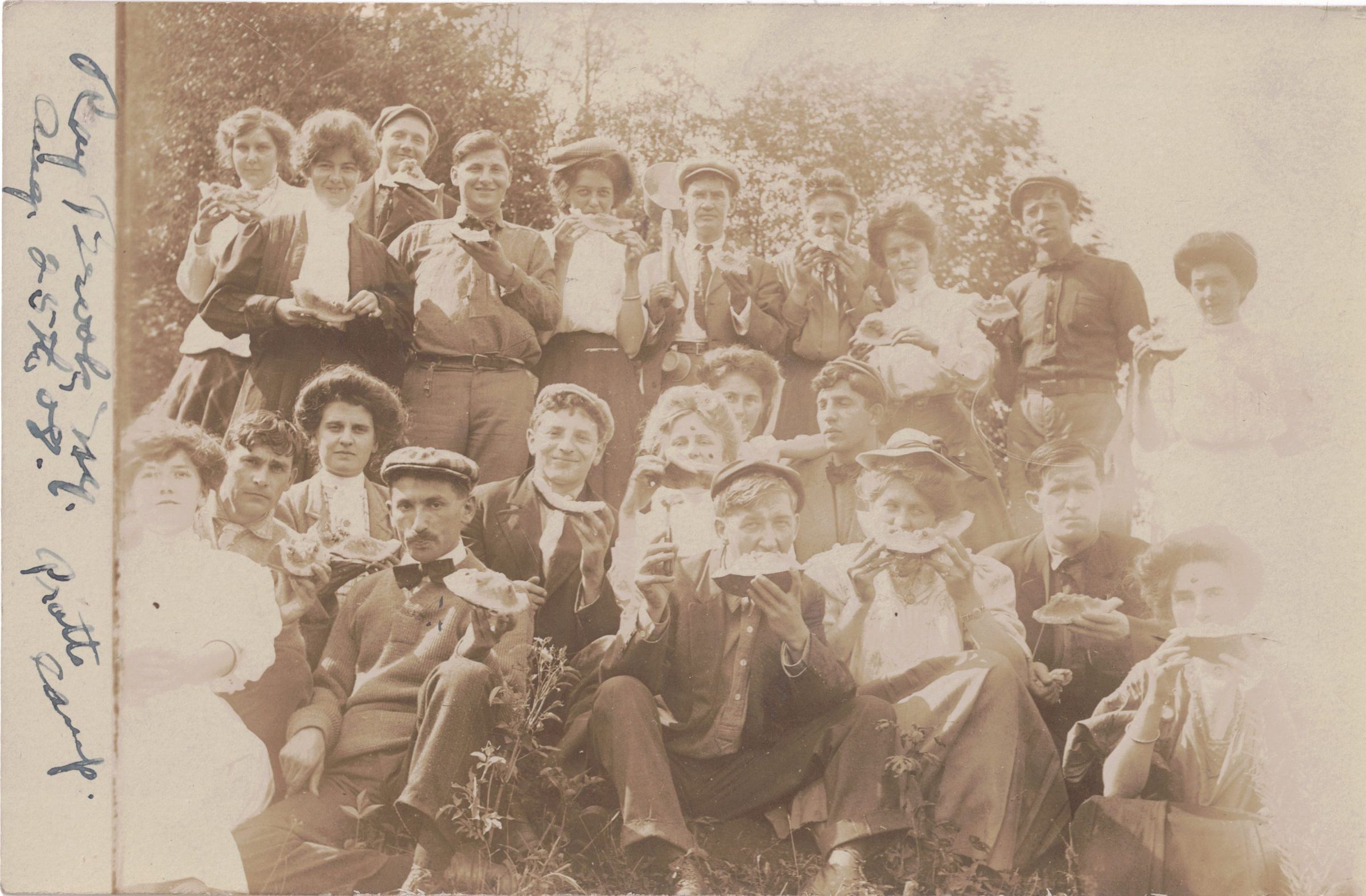 Photograph of a group of unidentified men and women outside eating watermelon. Caption reads "Ray Brook, NY Aug. 25th 08. Pratts Camp." Photograph has a blank postcard backing.