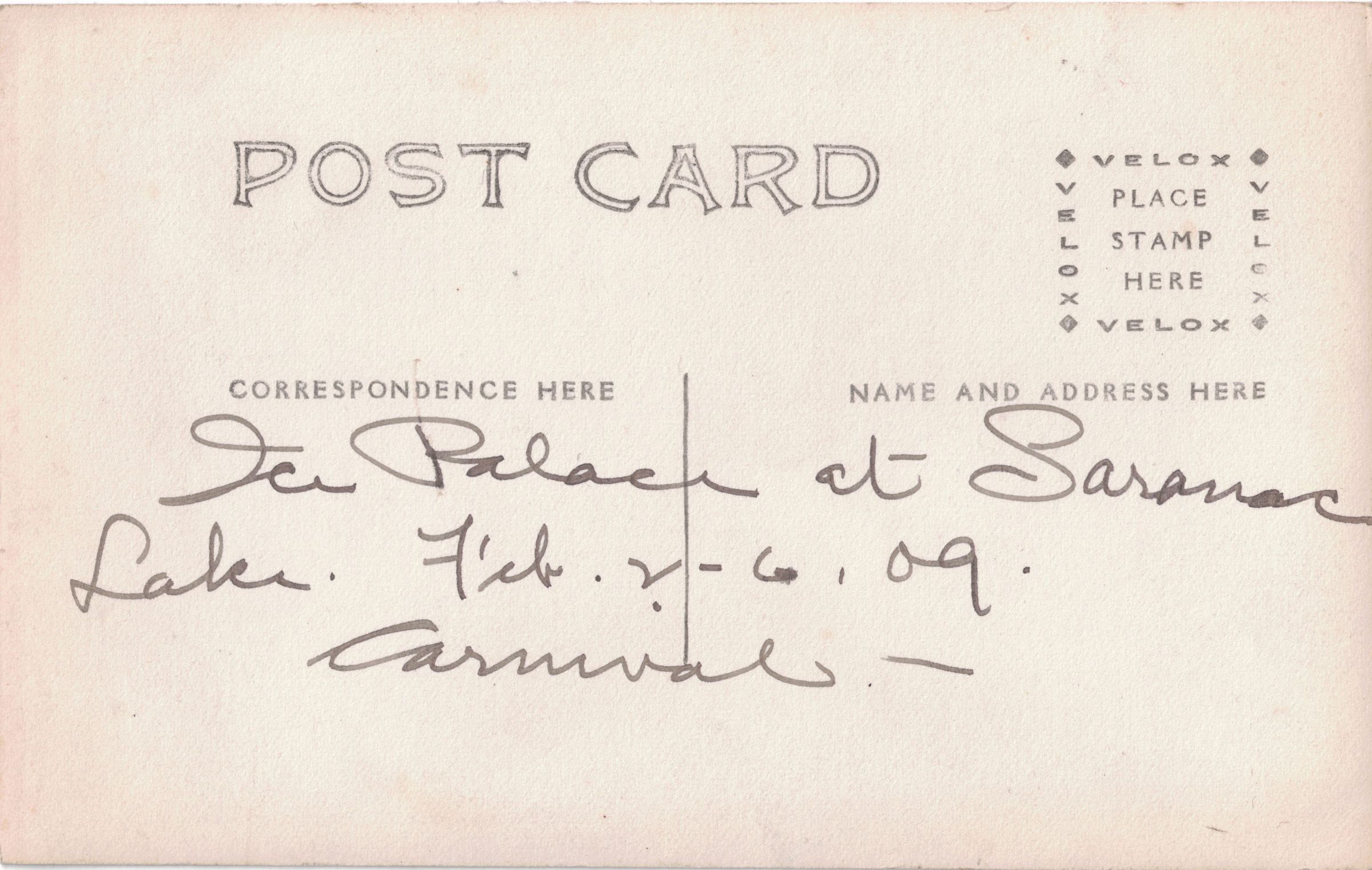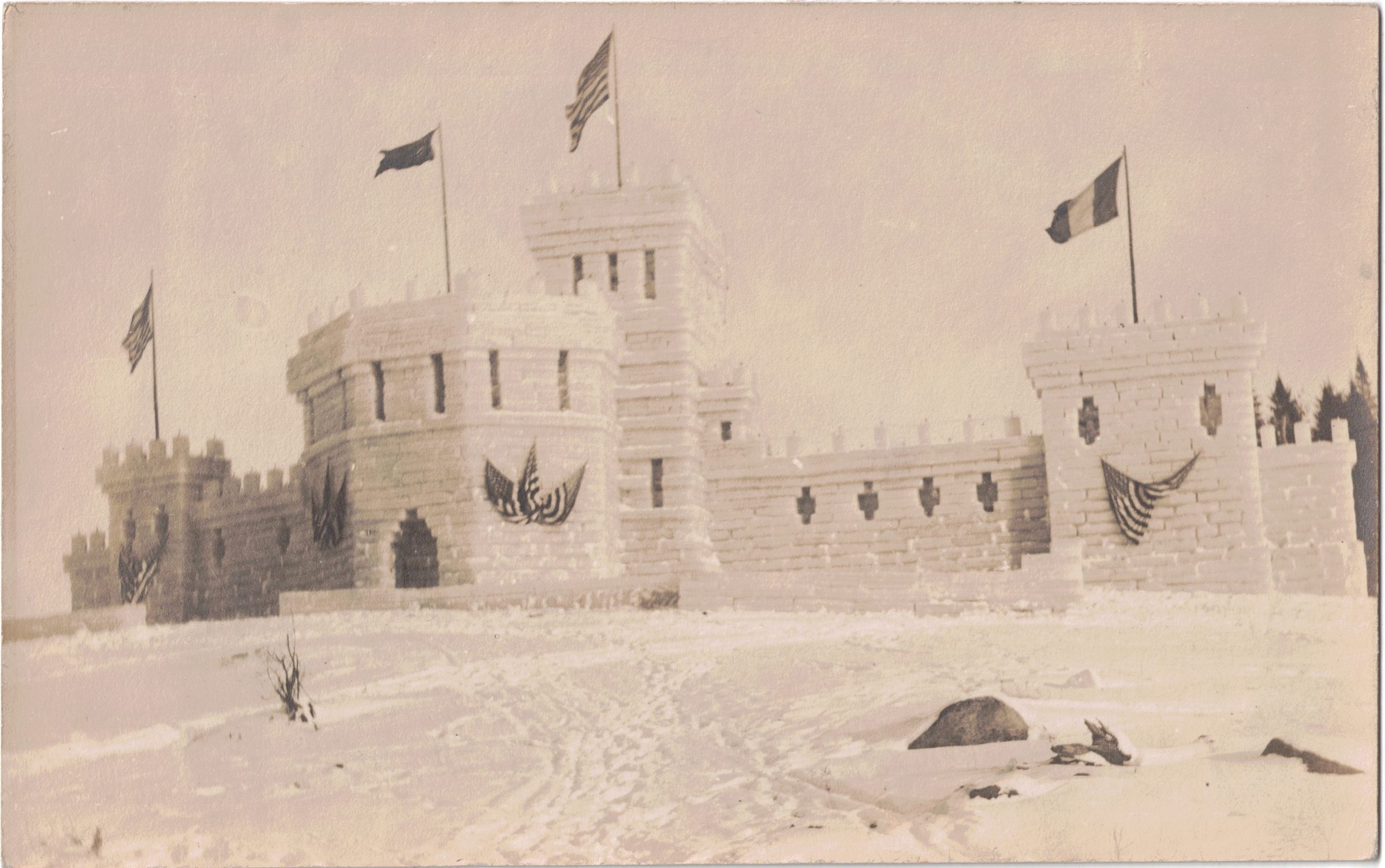 Photograph of the ice palace at the Saranac Lake Winter Carnival. Caption on reverse postcard backing reads "Ice Palace at Saranac Lake. Feb 2-6, 09. Carnival."