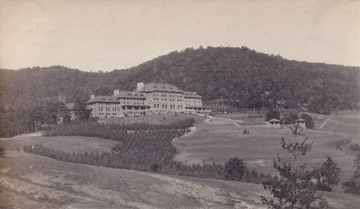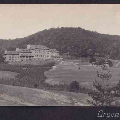 Black-and-white photograph of the Grove Park Inn in Asheville, North Carolina. The hotel is a large building built on the side of an incline. "Grove Park Inn" is written under the photograph in white ink.