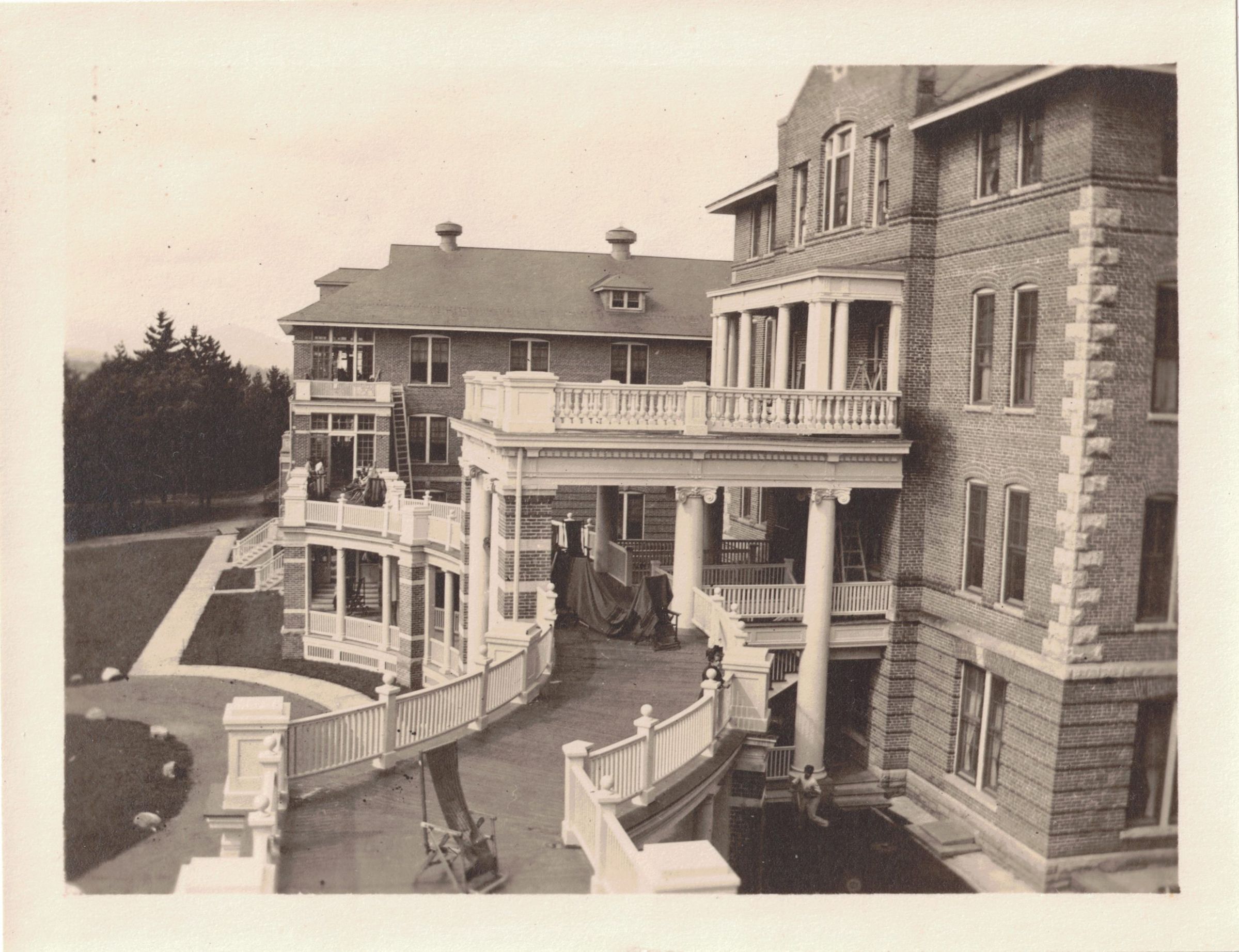 Photograph of the front/north facade of the Main Building at the New York State Hospital for Incipient Tuberculosis AKA Ray Brook Sanatorium, looking west.