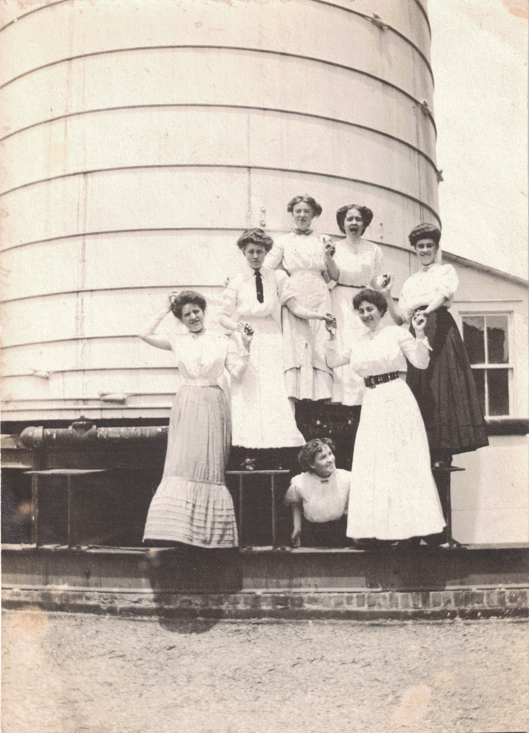 Photograph of Tarsilla Schuster (front right, wearing an all-white dress) standing with six unidentified women in front of a large silo-like structure. Their hands are linked and one woman is popping out from beneath a railing below the structure.