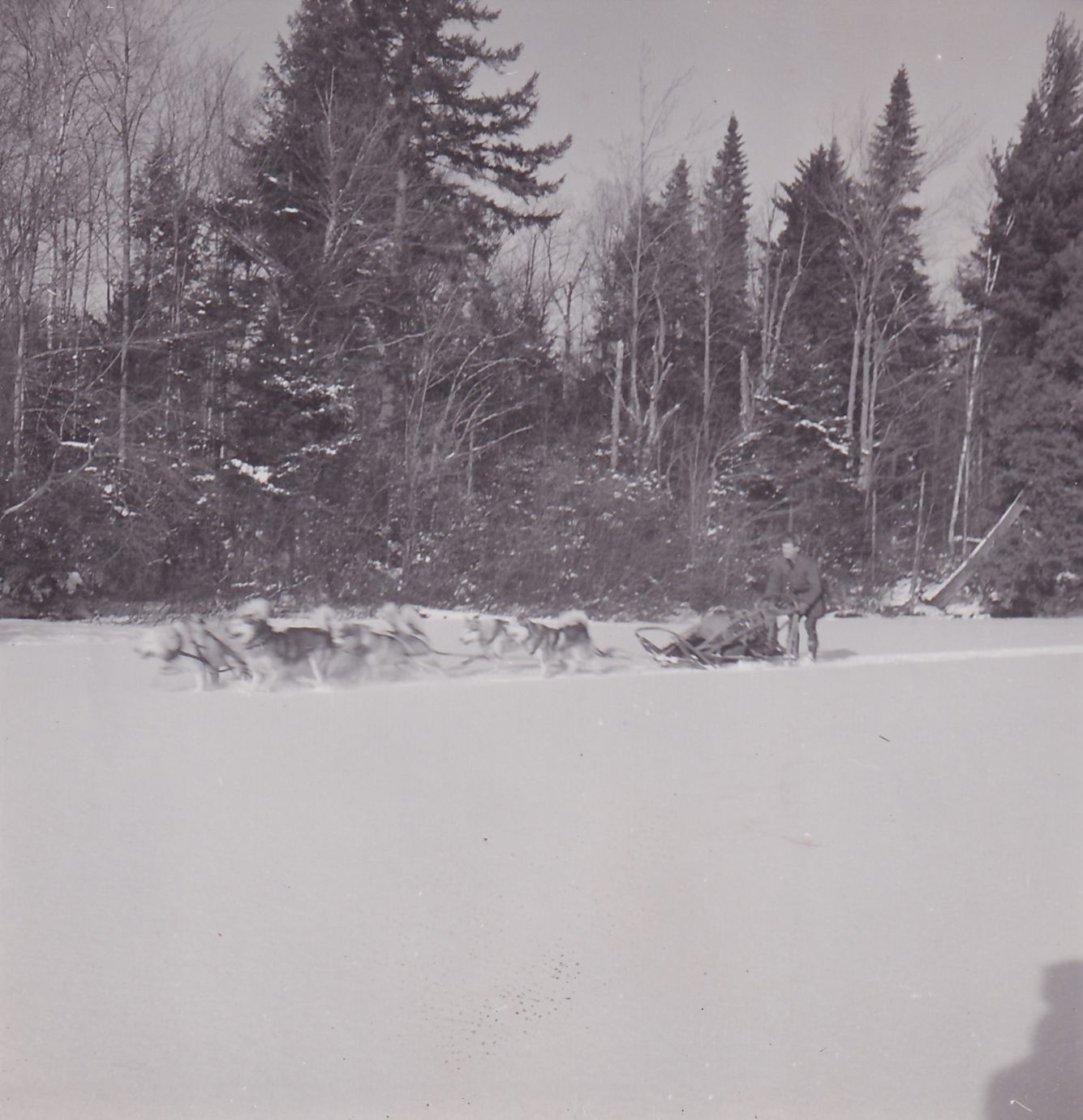 Black-and-White photograph of a man in a game warden uniform being pulled on a sled by a dog team.