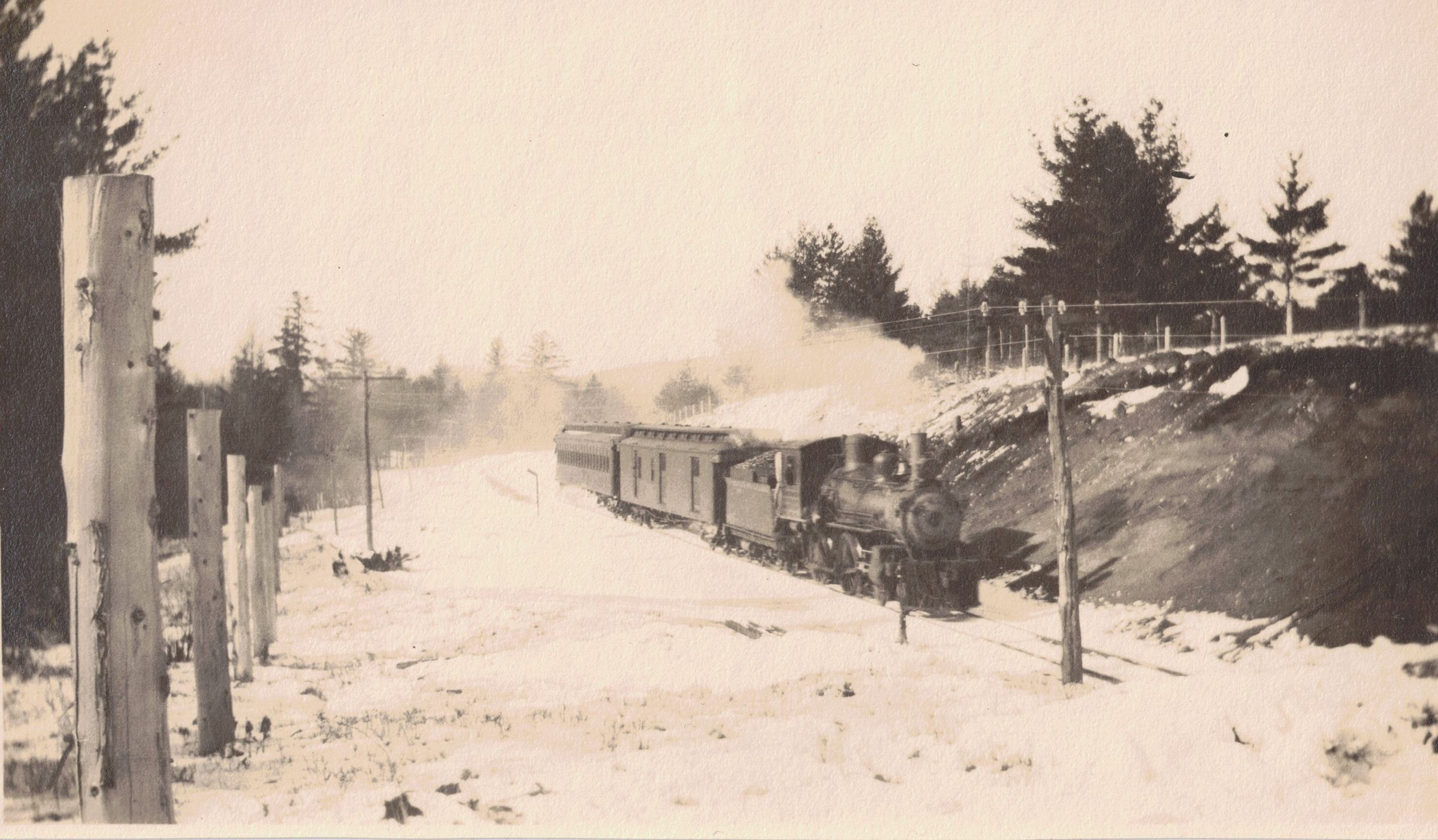 Photograph of a train coming down the tracks, surrounded by snow.