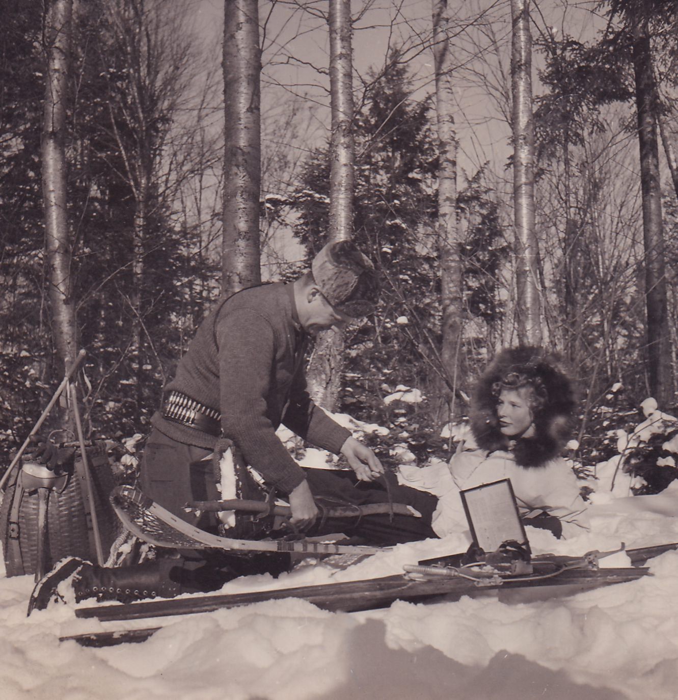 Black-and-White photograph of Carl Prue in a game warden uniform, using a branch to splint the leg of a woman in skiing gear.
