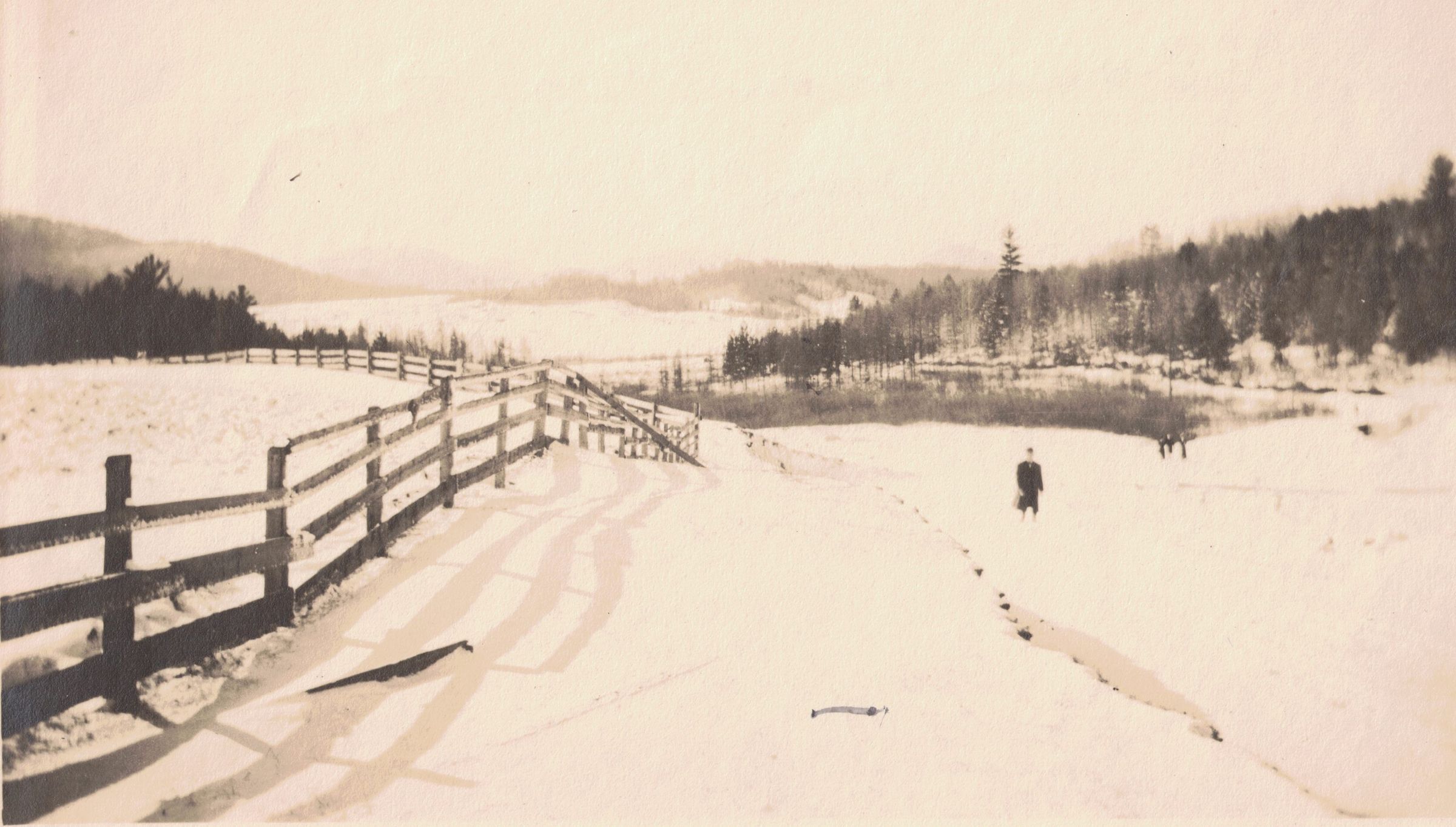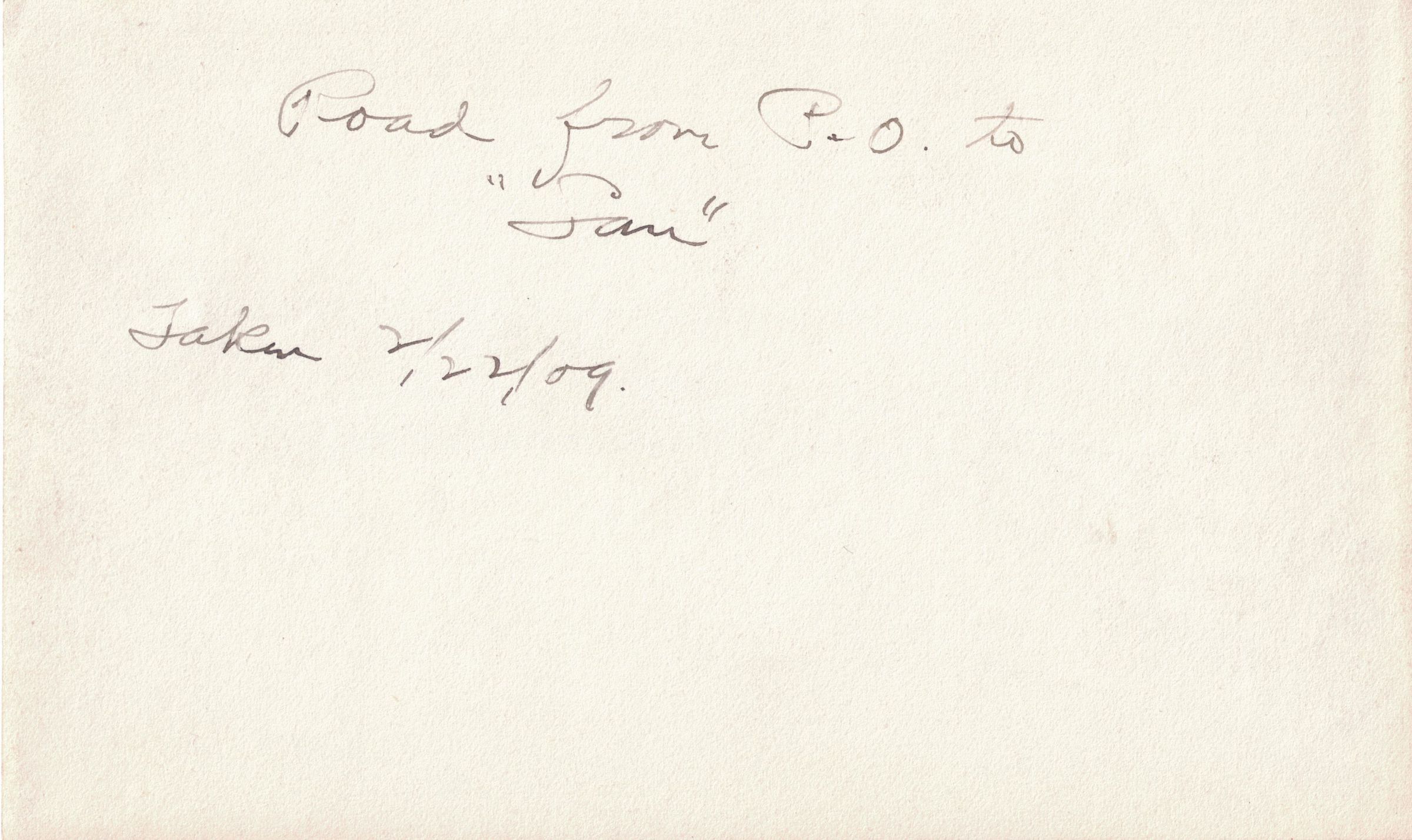 Photograph of a snow-covered landscape with a fence running through and mountains in the distance. A figure can be seen standing in the snow. Caption on reverse reads, "Road from P.O. to 'San'. Taken 2/22/09."