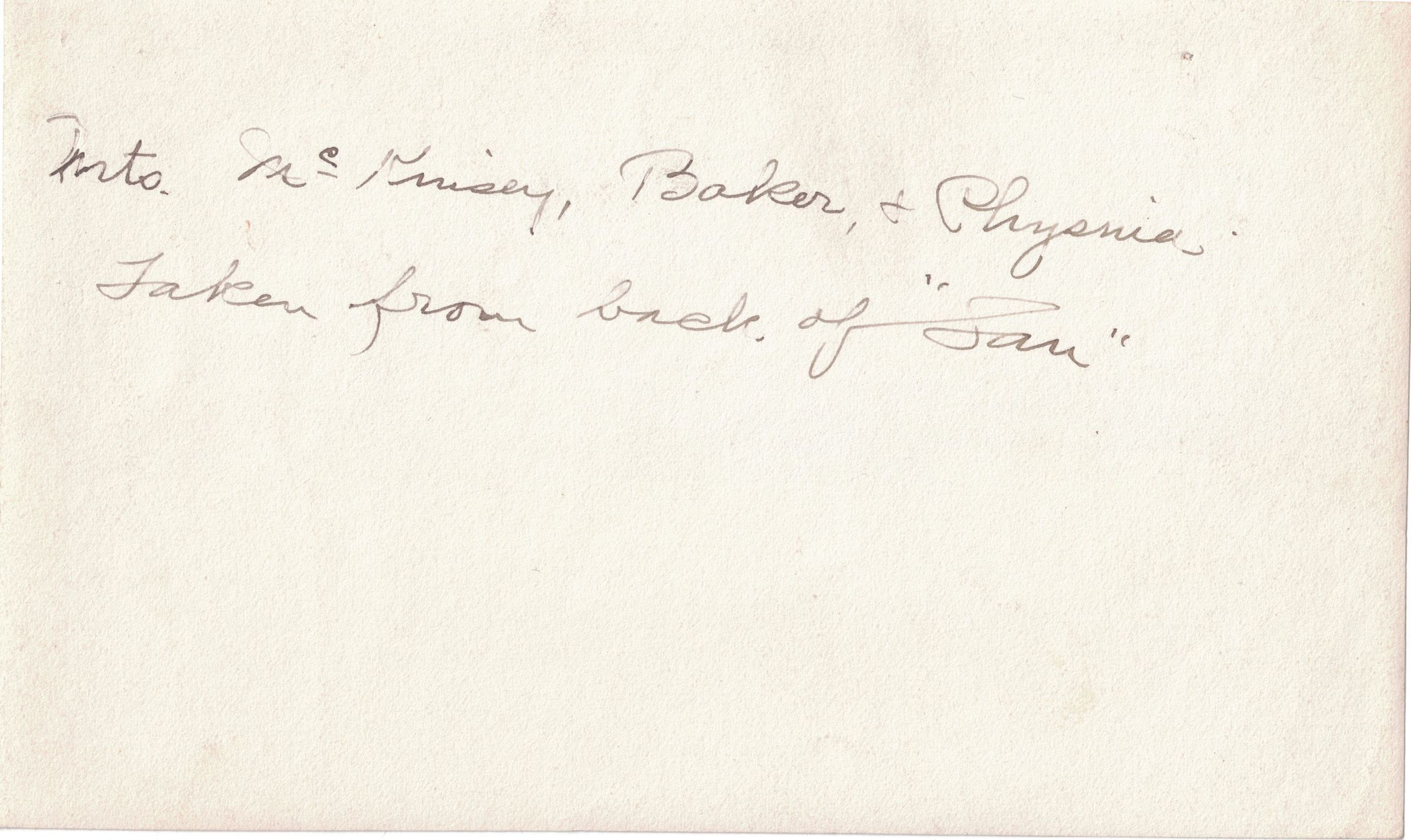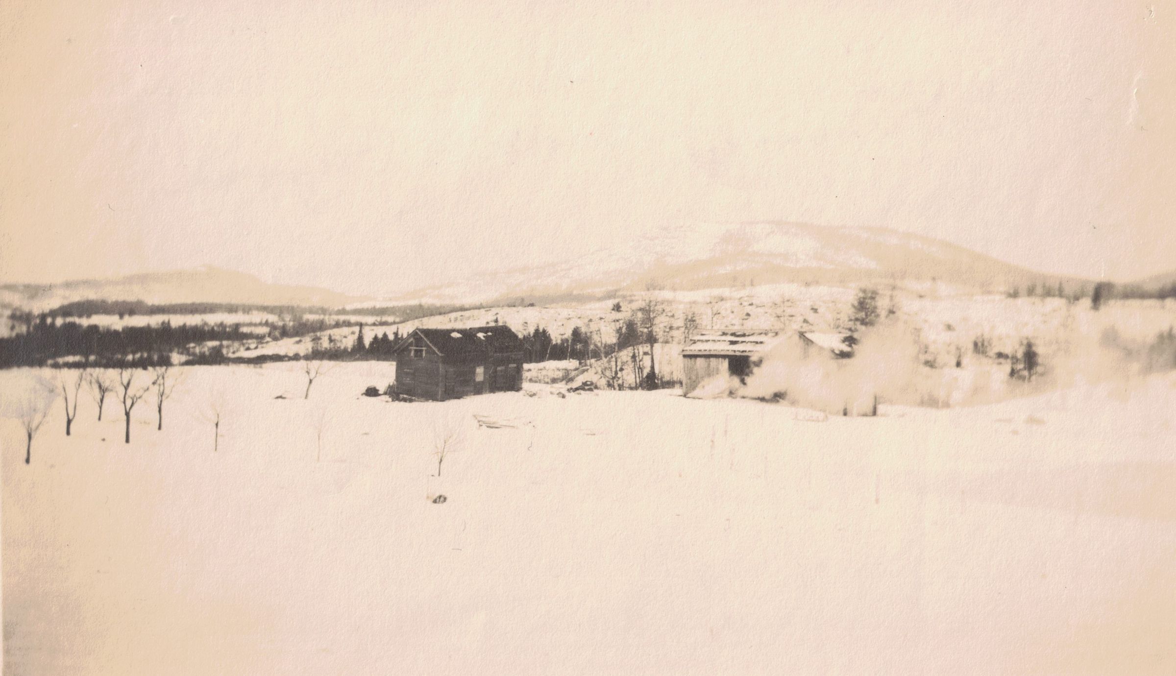 Photograph of a snow-covered landscape with mountains in the distance. Two structures can be seen in the foreground. Caption on reverse reads, "Mts. McKensey, Baker + Physnia. Taken from back of 'San'."