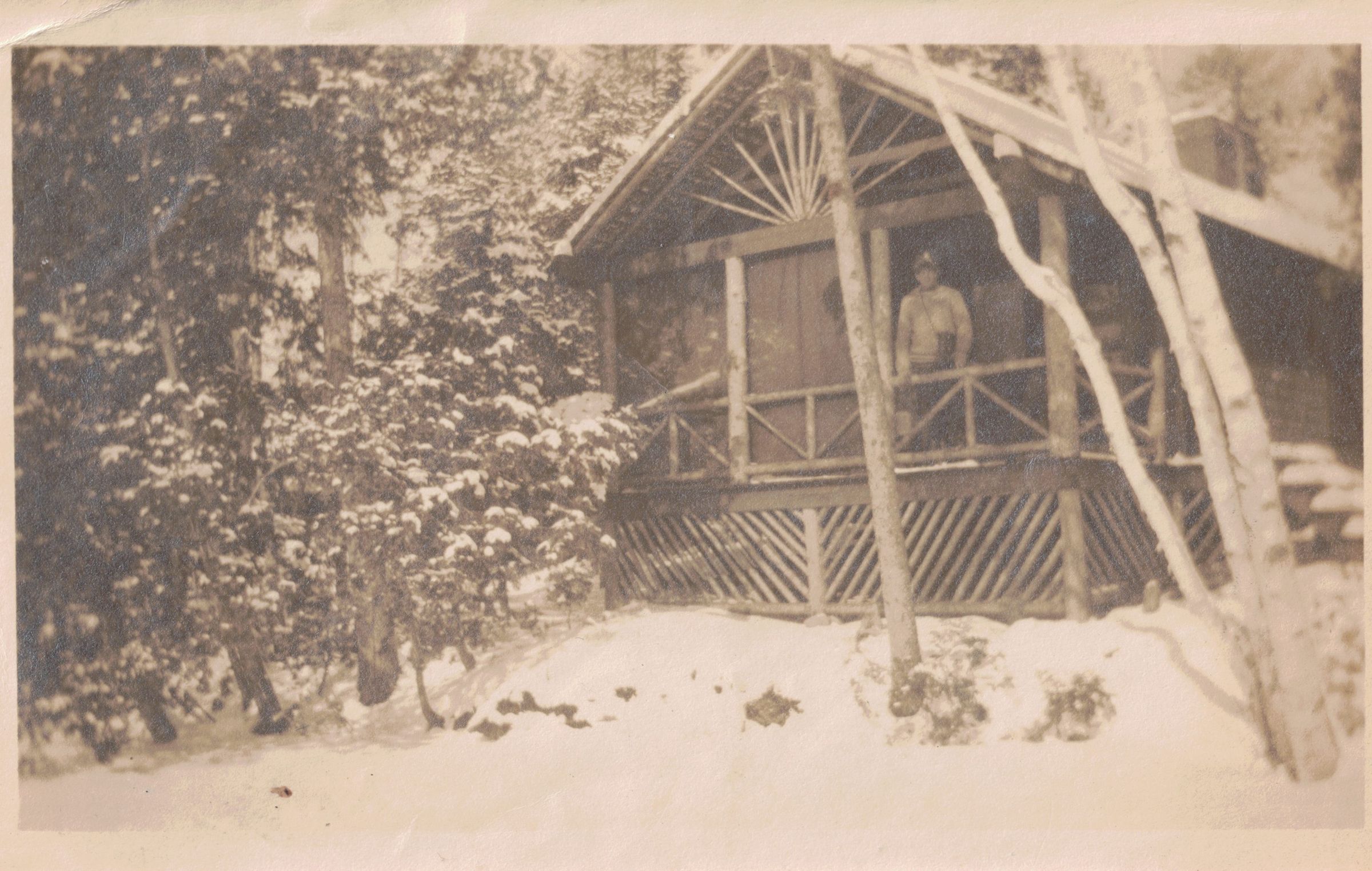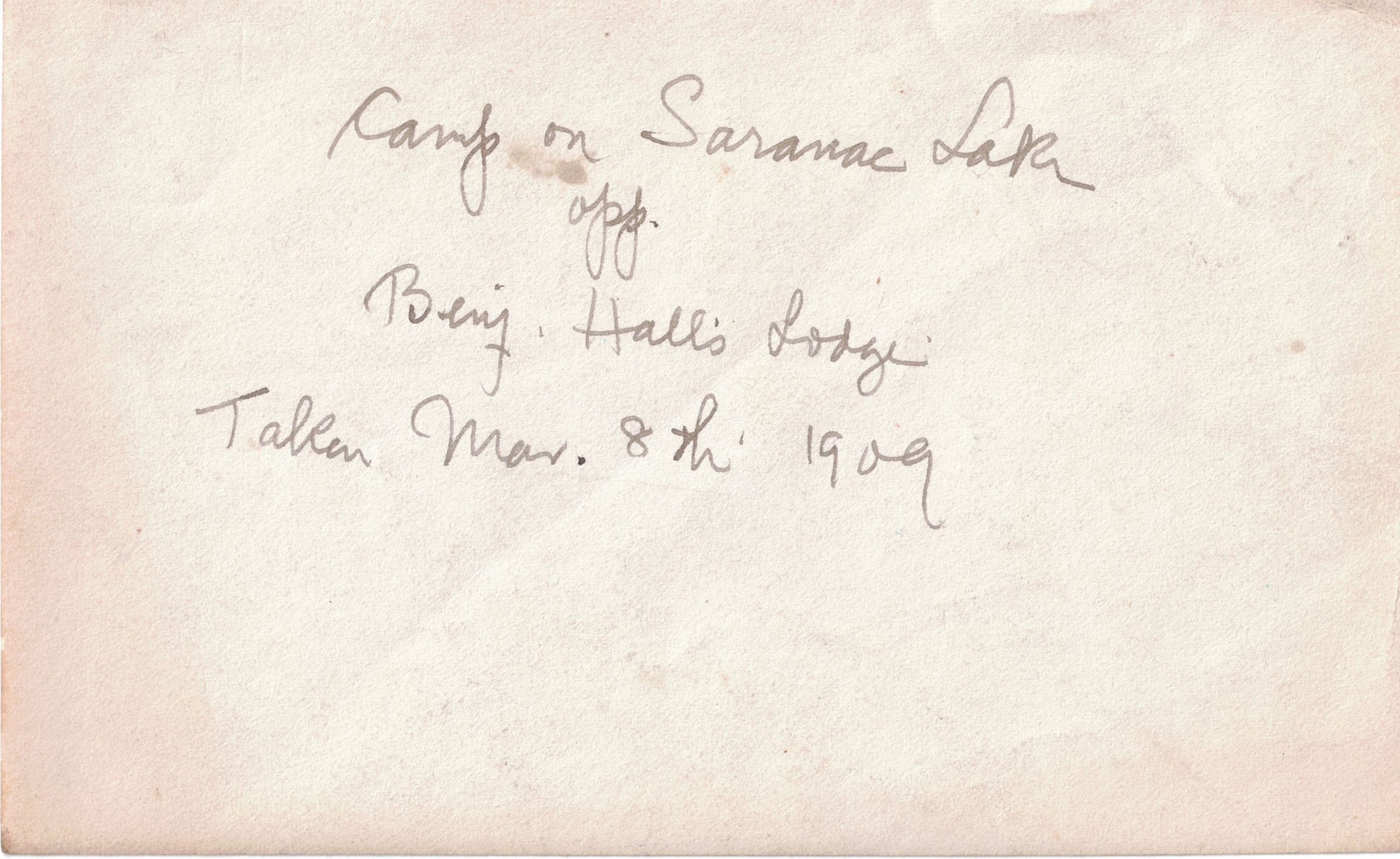 Photograph of a log cabin in the woods with an unidentified man standing on the porch. The surrounding landscape is covered in snow. Caption on reverse reads, "Camp on Saranac Lake opp. Benj. Hall's Lodge. Taken Mar. 8th 1909."