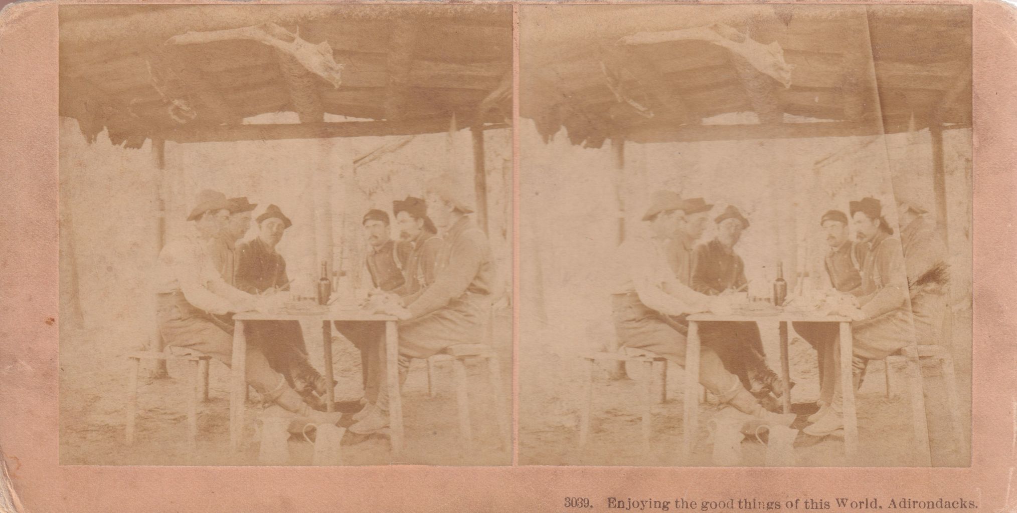 Stereoview image showing a group sitting at a table under a wooden structure. Printed caption on front reads, "Enjoying the Good Things of this World, Adirondacks." Photograph by Kilburn Brothers, Littleton, NH. Mounted on tan cardboard backing.