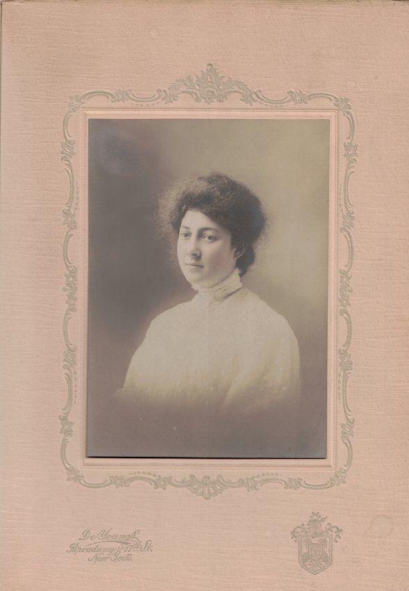 Photograph of Tarsilla Schuster with her hair worn up. The photo is glued to a backing frame and stamped by "DeYoungs' Broadway & 17th St. New York". Caption on reverse reads "Age 19 years 10 mo. 4 days. May 15, 08. WJS". Backing frame dimensions are 7" x 10".