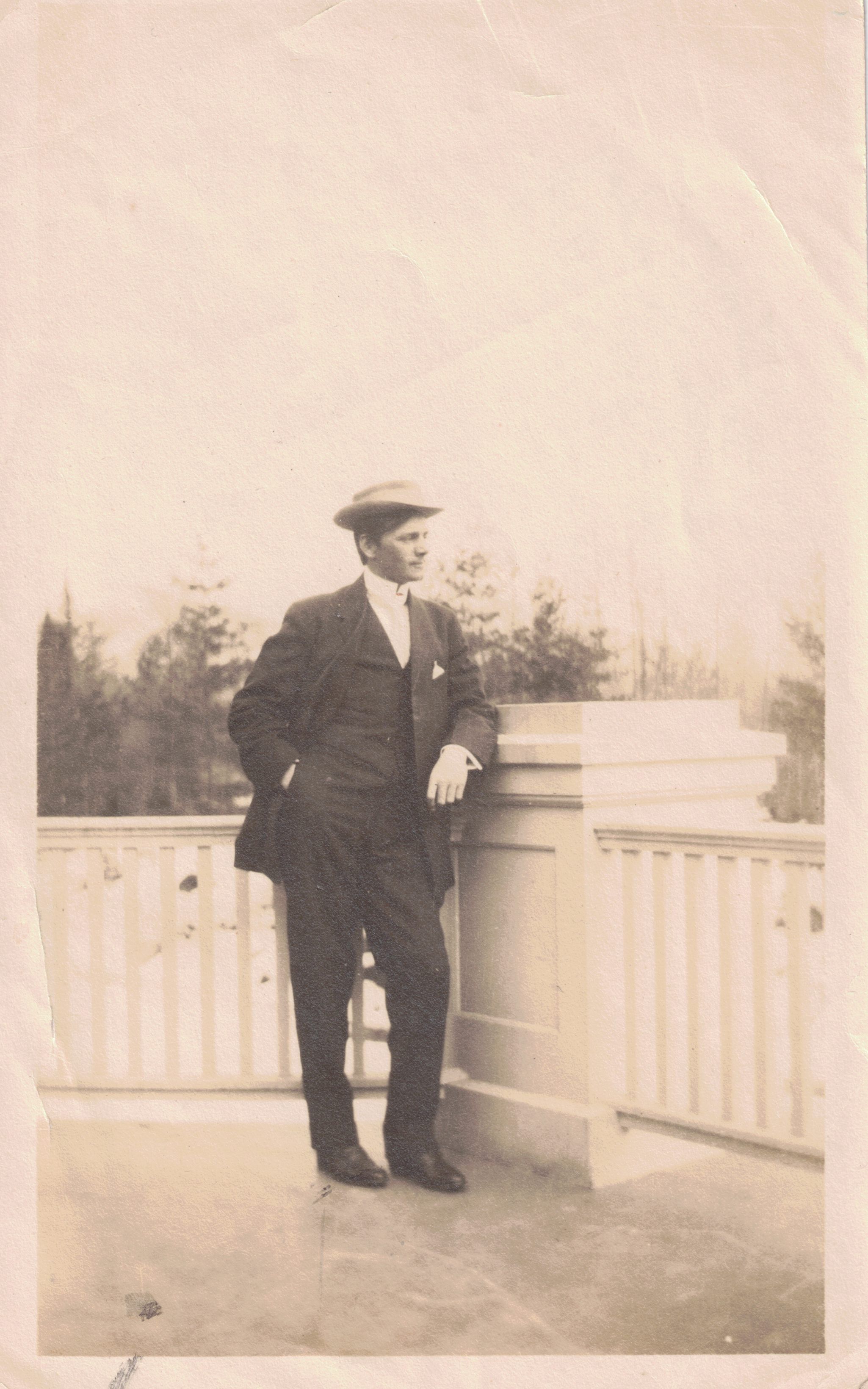 Photograph of William Schuster in a suit and hat, looking off into the distance. He is leaning his arm against a railing, likely on the veranda of the Main Building at the New York State Hospital for Incipient Tuberculosis, AKA Ray Brook Sanatorium. Caption on reverse reads, "Taken Palm Sunday Apr. 4th 1909."Photograph Details