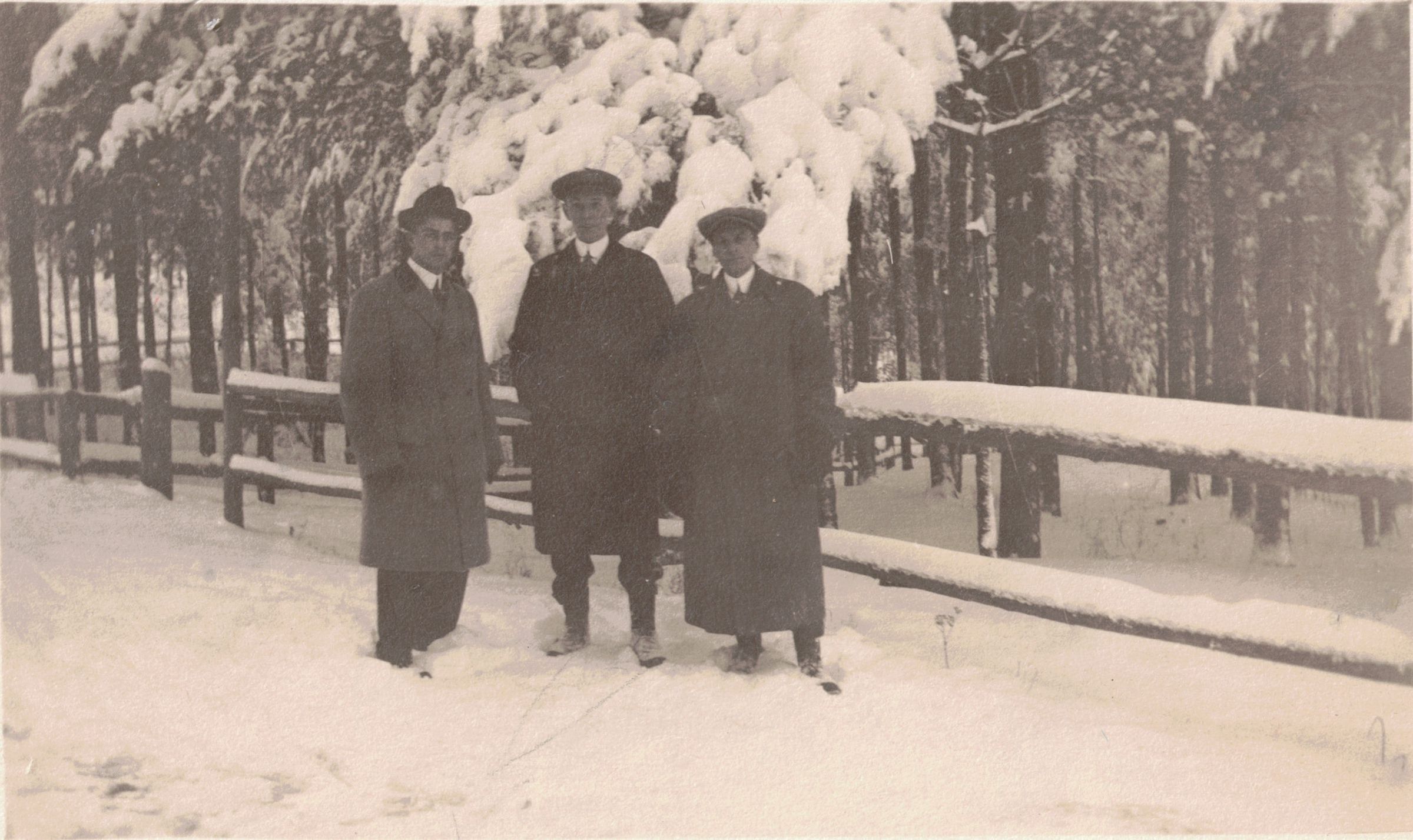 Photograph of William Schuster (right) and two unidentified men standing in front of snow covered trees. Caption on reverse reads "Dec 25, 1915."