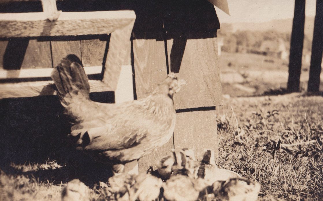 Black-and-white photograph of a chicken standing in front of a small coop.