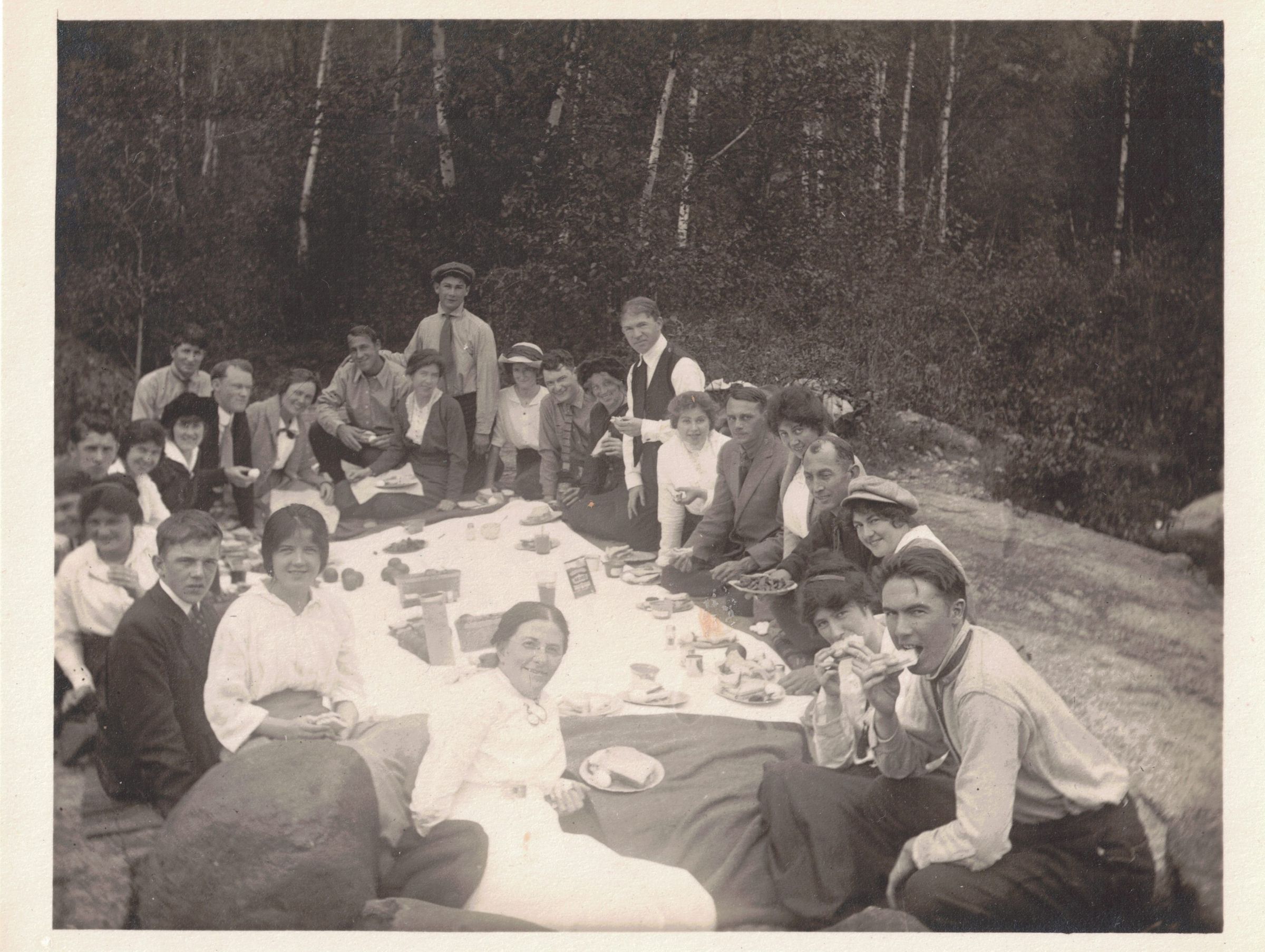 Photograph of a group of people having a picnic, seated around a blanket eating sandwiches. William and Tarsilla Schuster are shown to the right side of the photo, fifth and sixth pictured from the bottom.