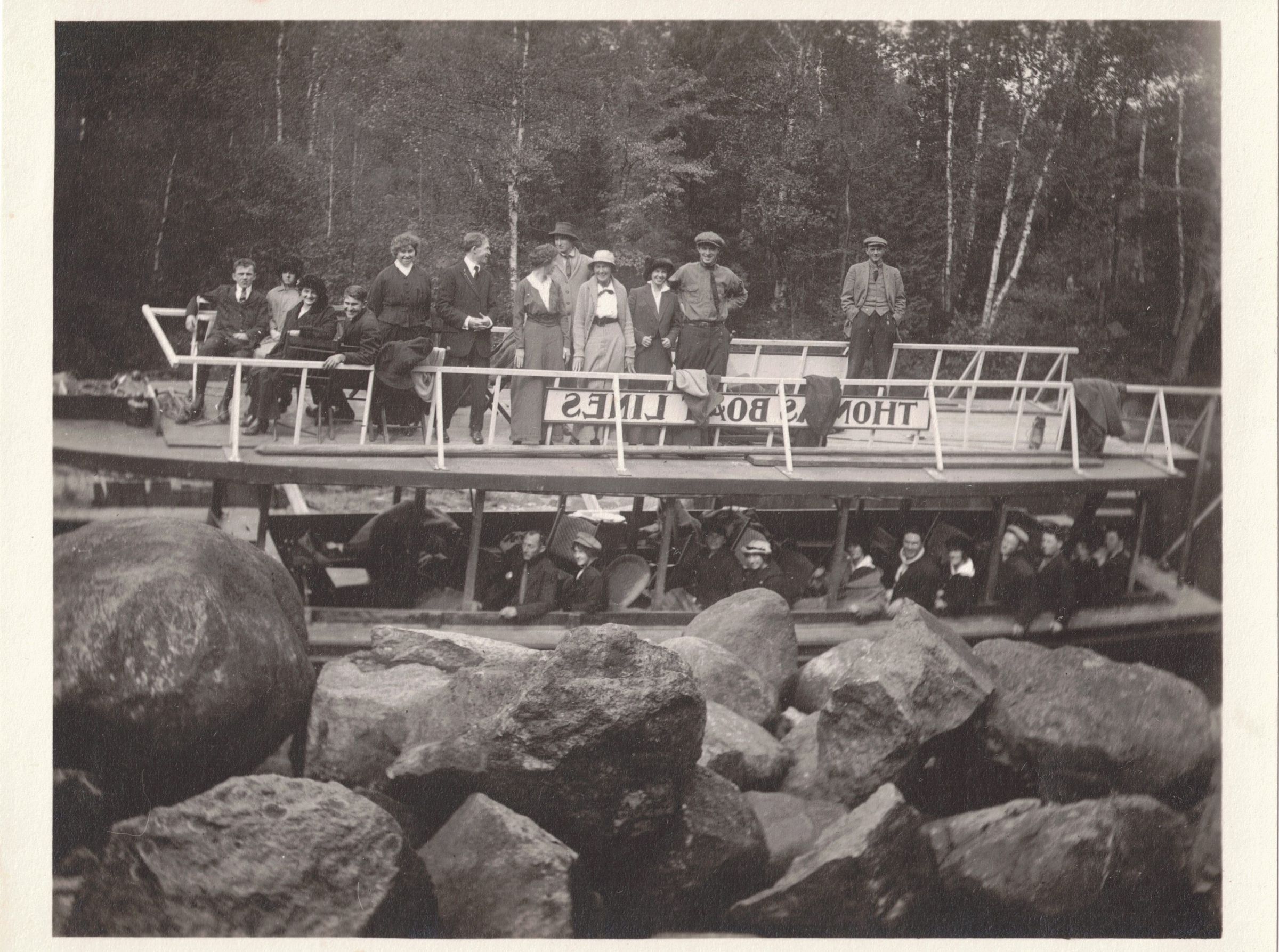 Photograph of a group of men and women on a double decker boat, with rocks in the foreground. William Schuster can be seen on the top deck, far right. Tarsilla Schuster can be seen on the bottom deck, center, in a white hat. The boat has a sign on it that reads, "Thomas Boat Lines," but it is reversed in the image. It is possible that this image was printed backwards.Photograph Details