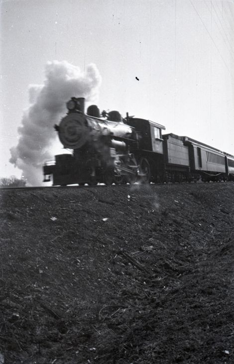 Negative of a steam train running along a railroad. There is dirt to either side of the tracks. Most likely taken by Mary Ives Baldwin. This item is not fully cataloged but has been uploaded so the image is publicly available; if you would like us to prioritize cataloging this item, please contact the HSL Collections team.