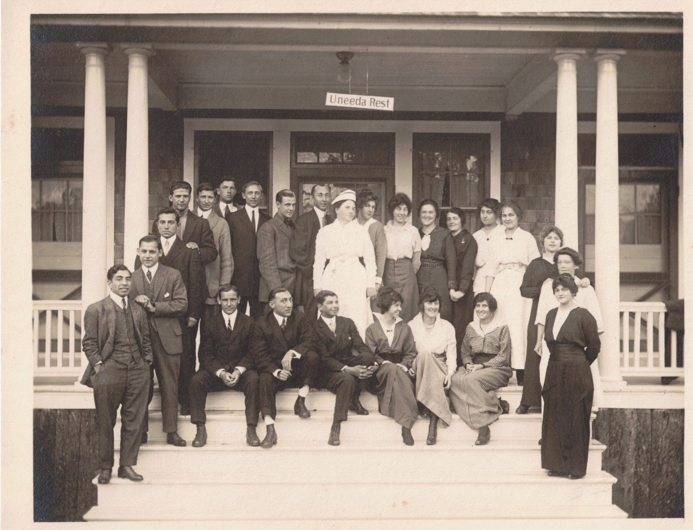 Photograph of a group of people sitting and standing on a porch with a nurse in the center. Tarsilla Schuster can be seen standing in the top row, eighth from the right. William Schuster is seated in the bottom row, first on the left. The sign hanging above them reads "Uneeda Rest."