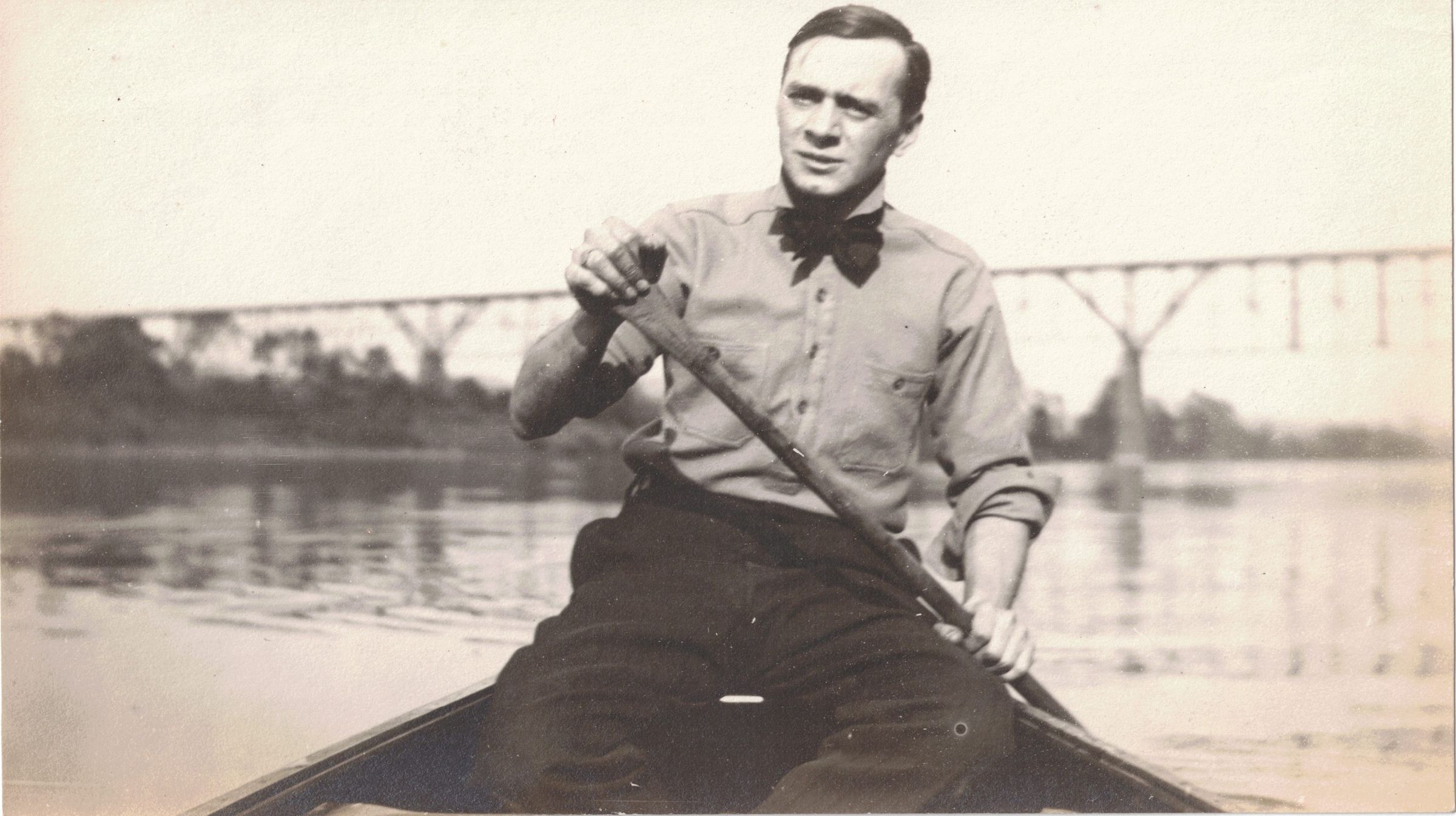 Photograph of William Schuster paddling a boat. The photo is a close up shot; William has a bow tie and rolled up sleeves, with a paddle in hand. An unidentified bridge can be seen behind him.