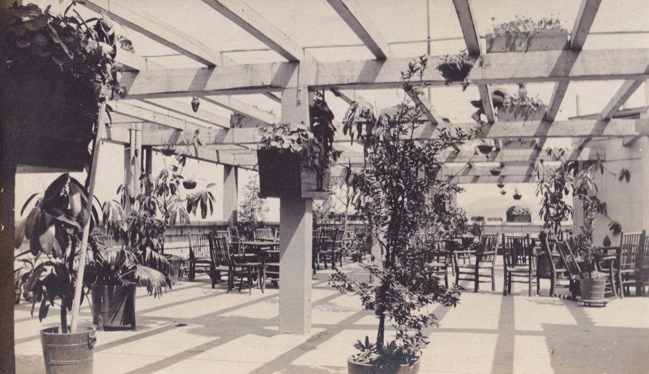 Black-and-white photograph of an outdoor restaurant or similar seating area. There is a pergola overhead with many plants on the ground and hanging from the pergola as well.