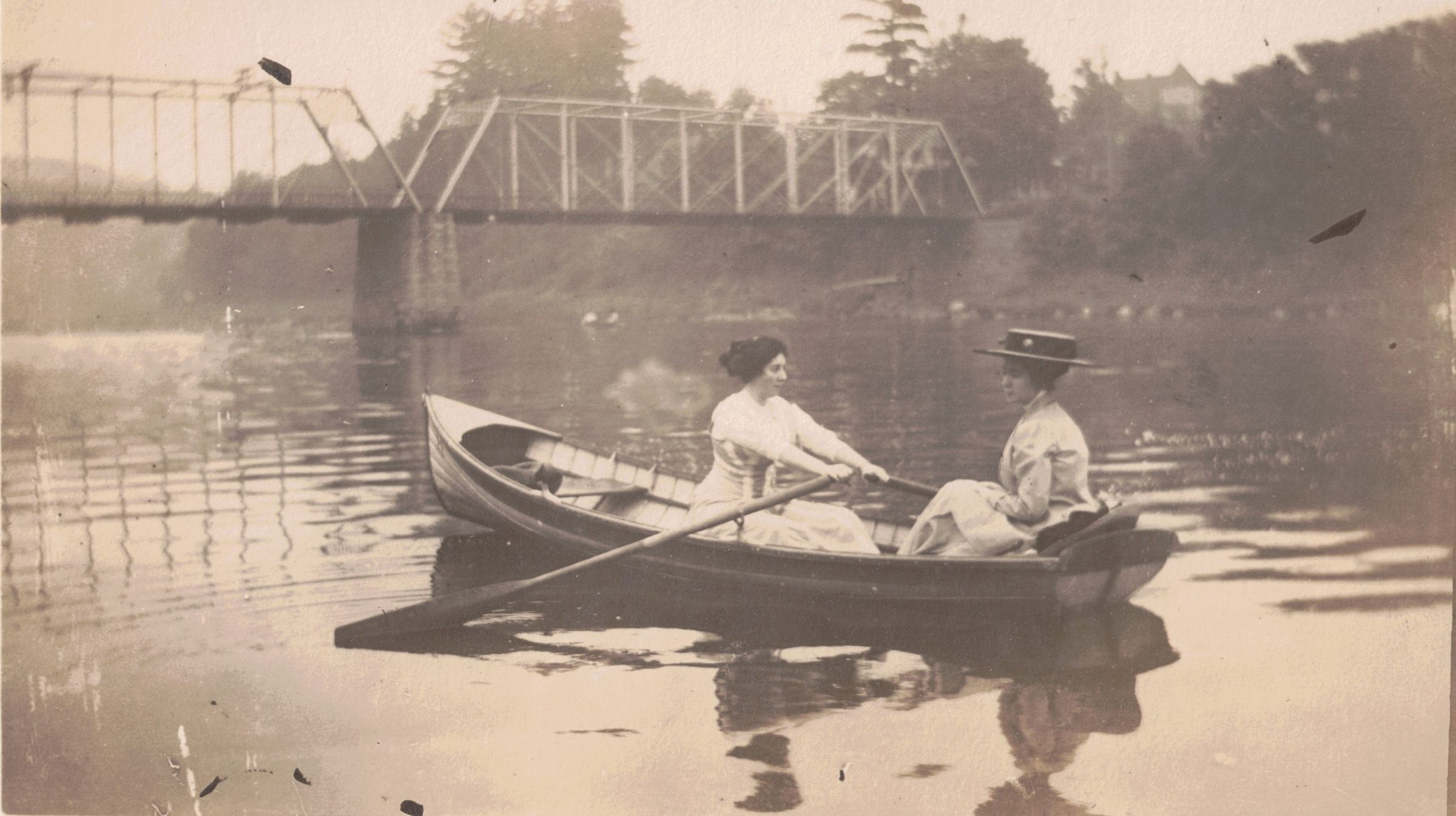 Photograph of Tarsilla Schuster, left, rowing an unidentified woman in a square back canoe or boat. A bridge can be seen in the background.