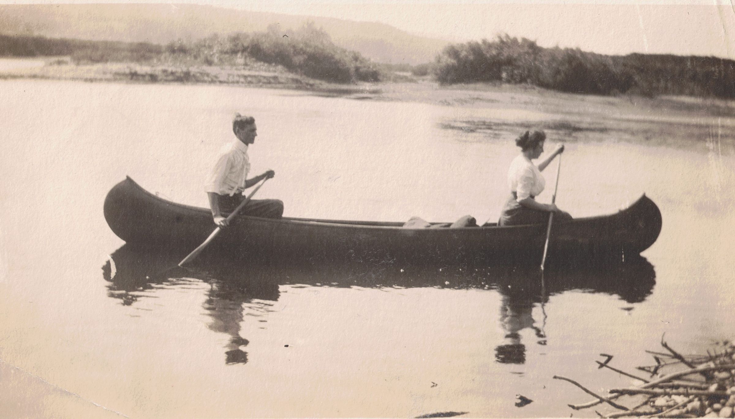 Photograph of William and Tarsilla Schuster paddling a canoe. William is seated at the back of the boat and Tarsilla is in the front. Caption on reverse reads, "Mother + Dad."