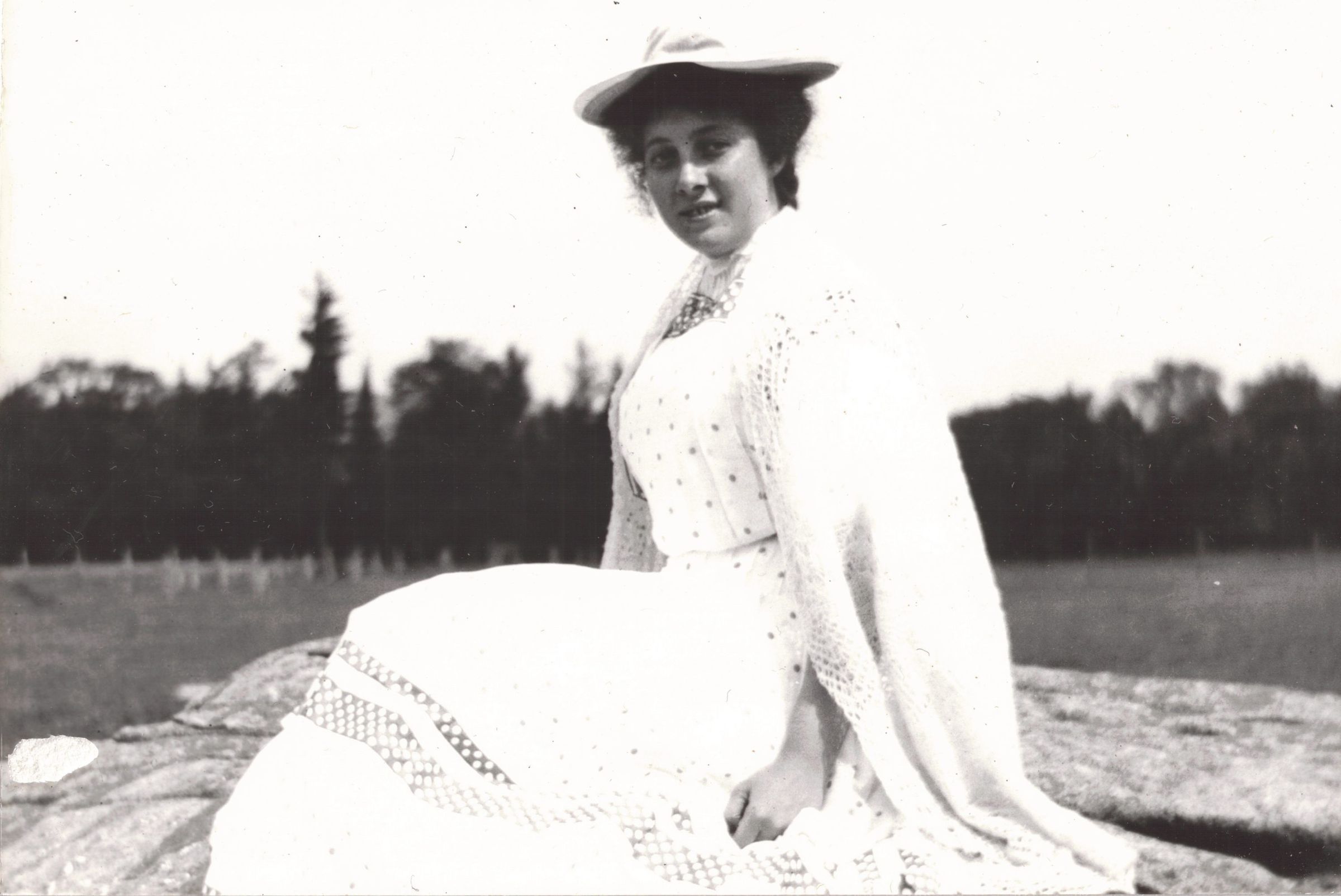 Photograph of Tarsilla Schuster seated on a rock. She wears a hat and shawl.