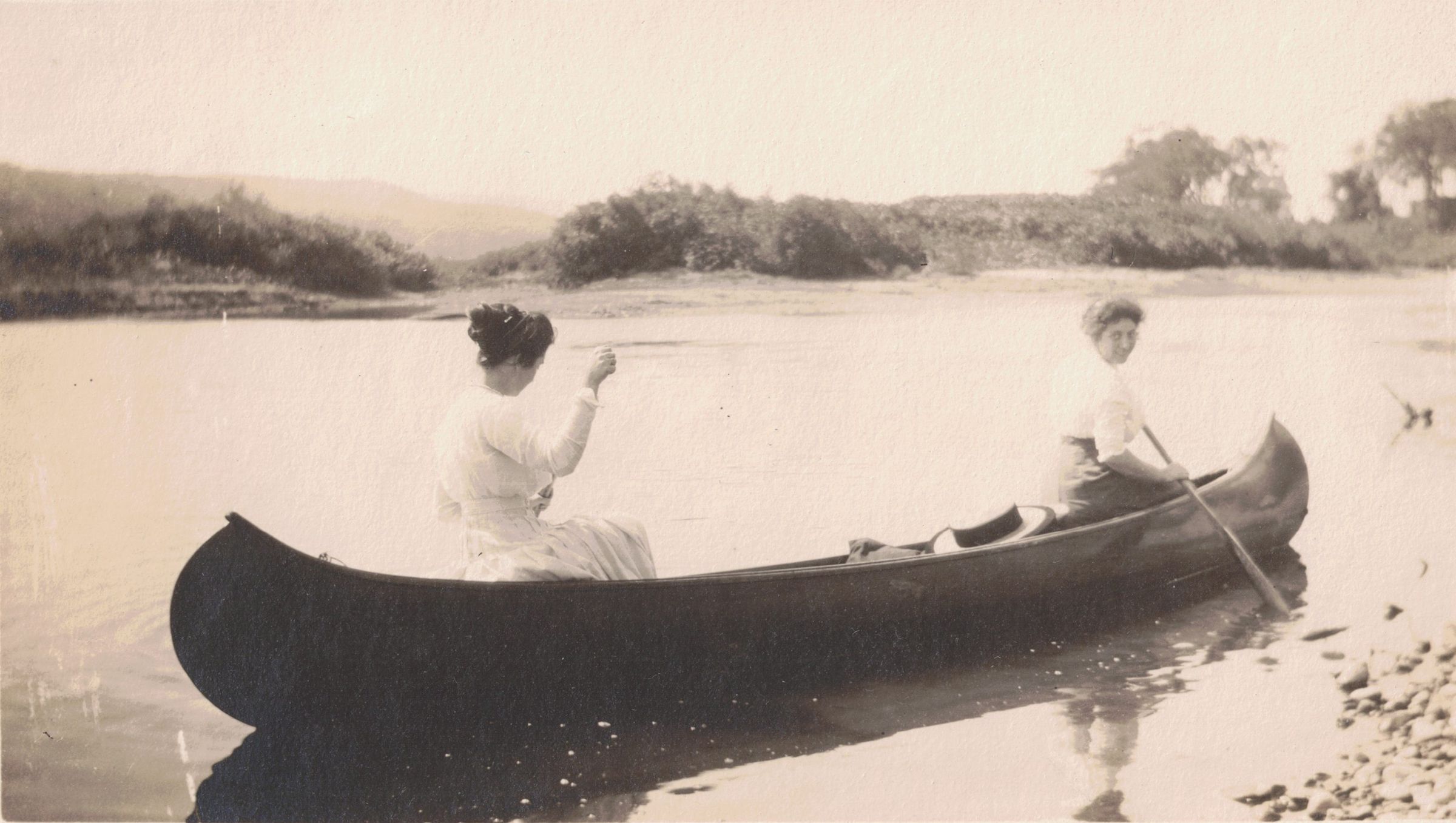 Photograph of Tarsilla Schuster and an unidentified woman paddling a canoe. Tarsilla is sitting in the front and looking back toward the camera.