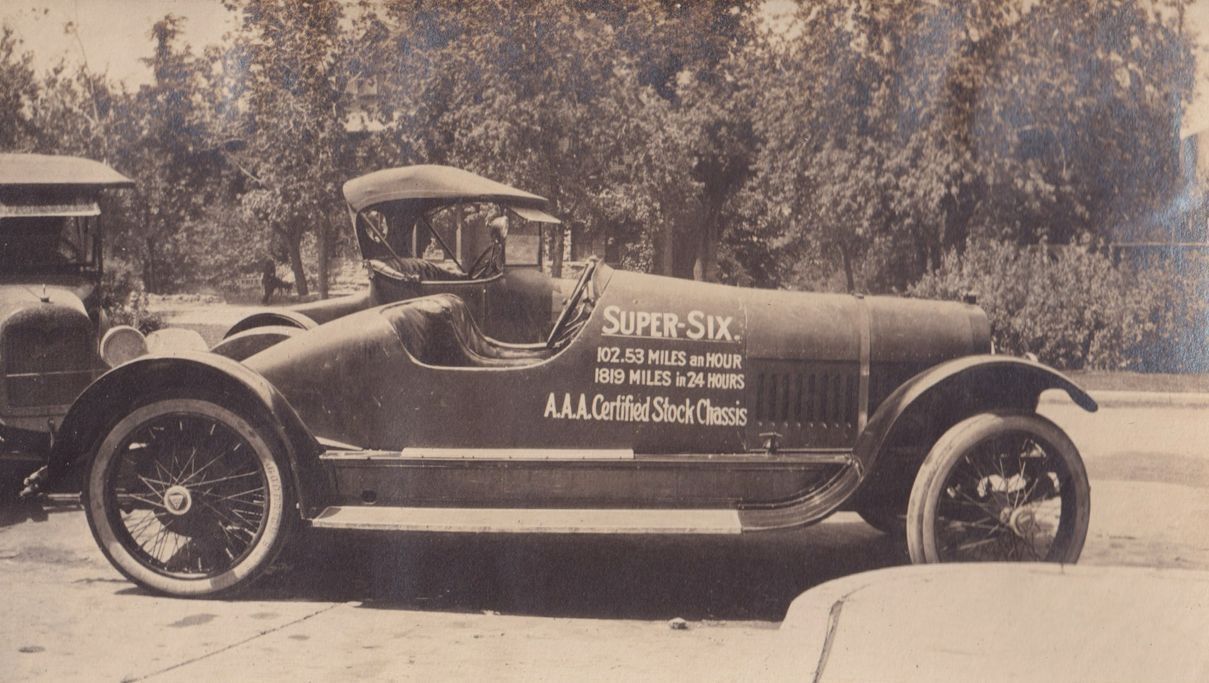 Black-and-white photograph of a car parked next to a sidewalk. There are two other cars parked around the one in the forefront of the photo. "Super-Six 102.53 Miles an Hour 1819 Miles in 24 Hours A.A.A. Certified Stock Chessis" is painted in white pain on the side of the main car.