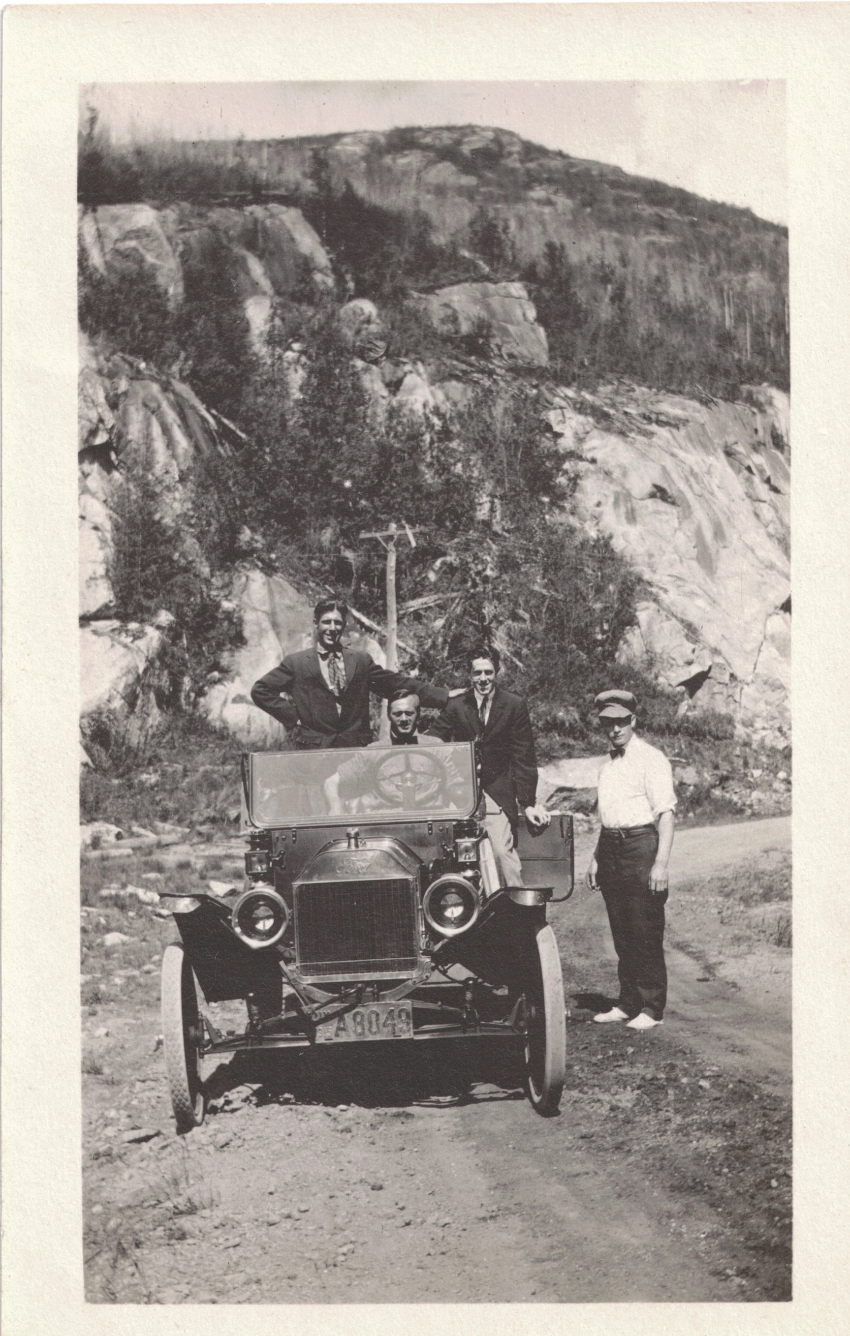 Photograph of William Schuster and three unidentified men sitting in and standing around a car. William sits at the steering wheel. Caption on reverse reads, "Taken at Meacham Lake, NY June 7, 1915."