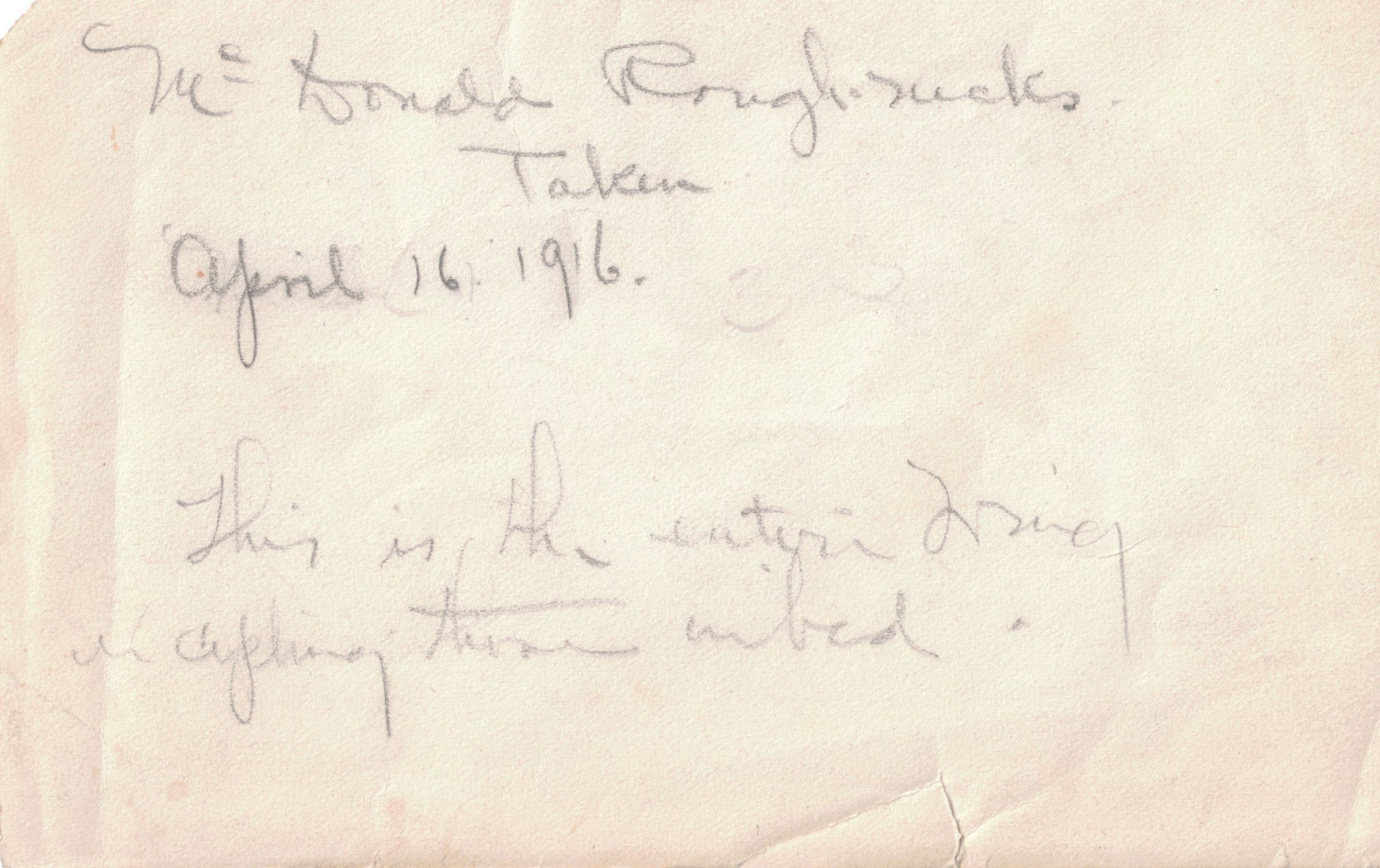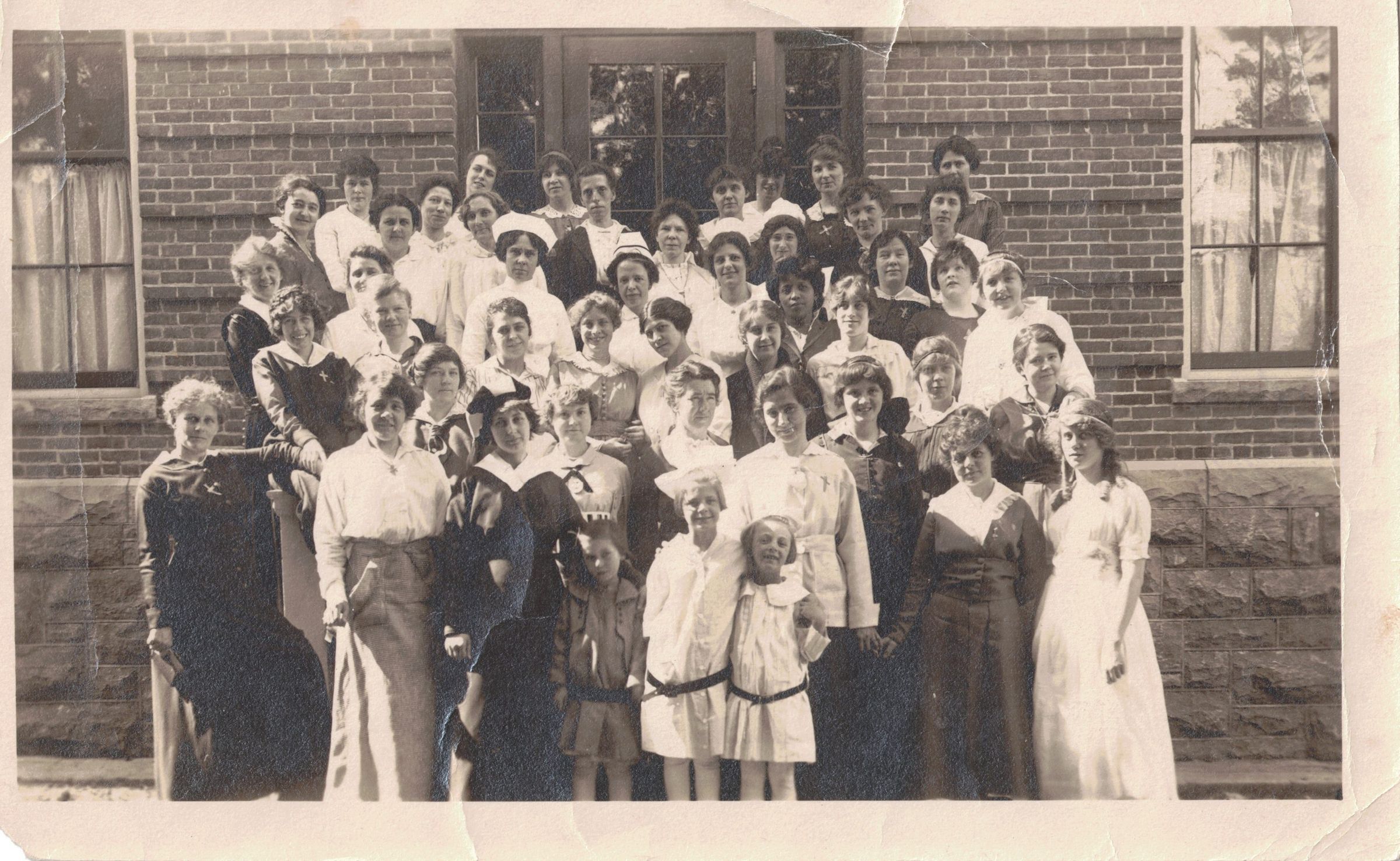 Photograph of a group of unidentified women and girls standing on the steps of the McDonald Wing of the Main Building at the New York State Hospital for Incipient Tuberculosis, AKA Ray Brook Sanatorium. Some of the women are in nurses' uniforms. Caption on reverse reads, "McDonald Roughnecks Taken April 16, 1916. This is the entire wing excluding those in bed."Photograph Details