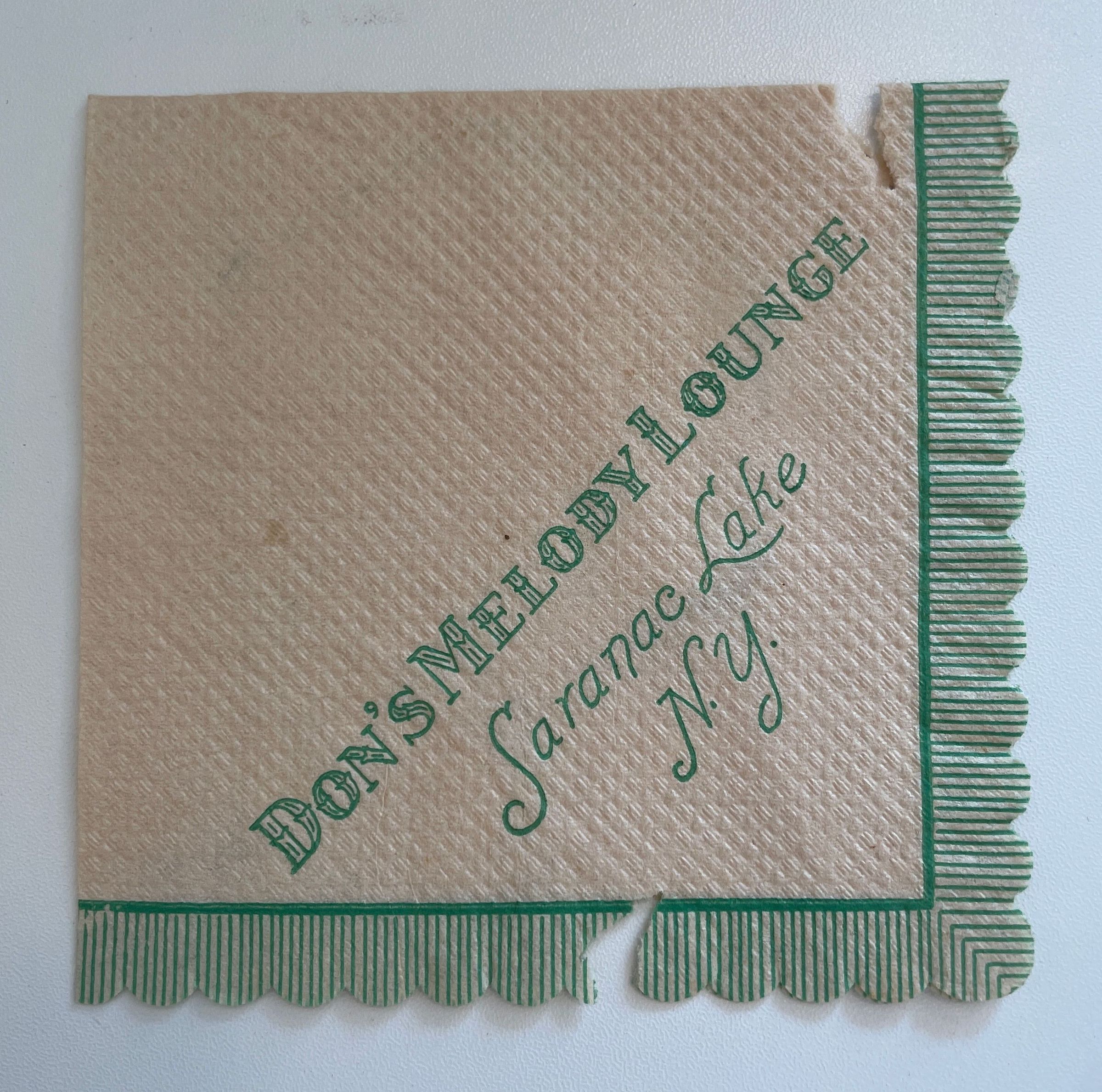 Paper napkin from Don's Melody Lounge, Saranac Lake. Green ink on white background with scalloped edges.