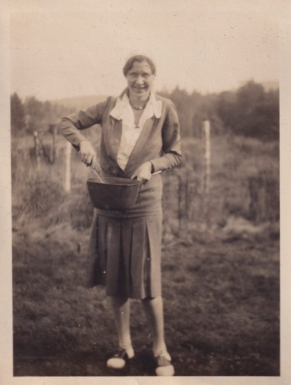 Black-and-White photograph of an unidentified woman, possibly a tuberculosis patient, standing outside. She is stirring a large pot.